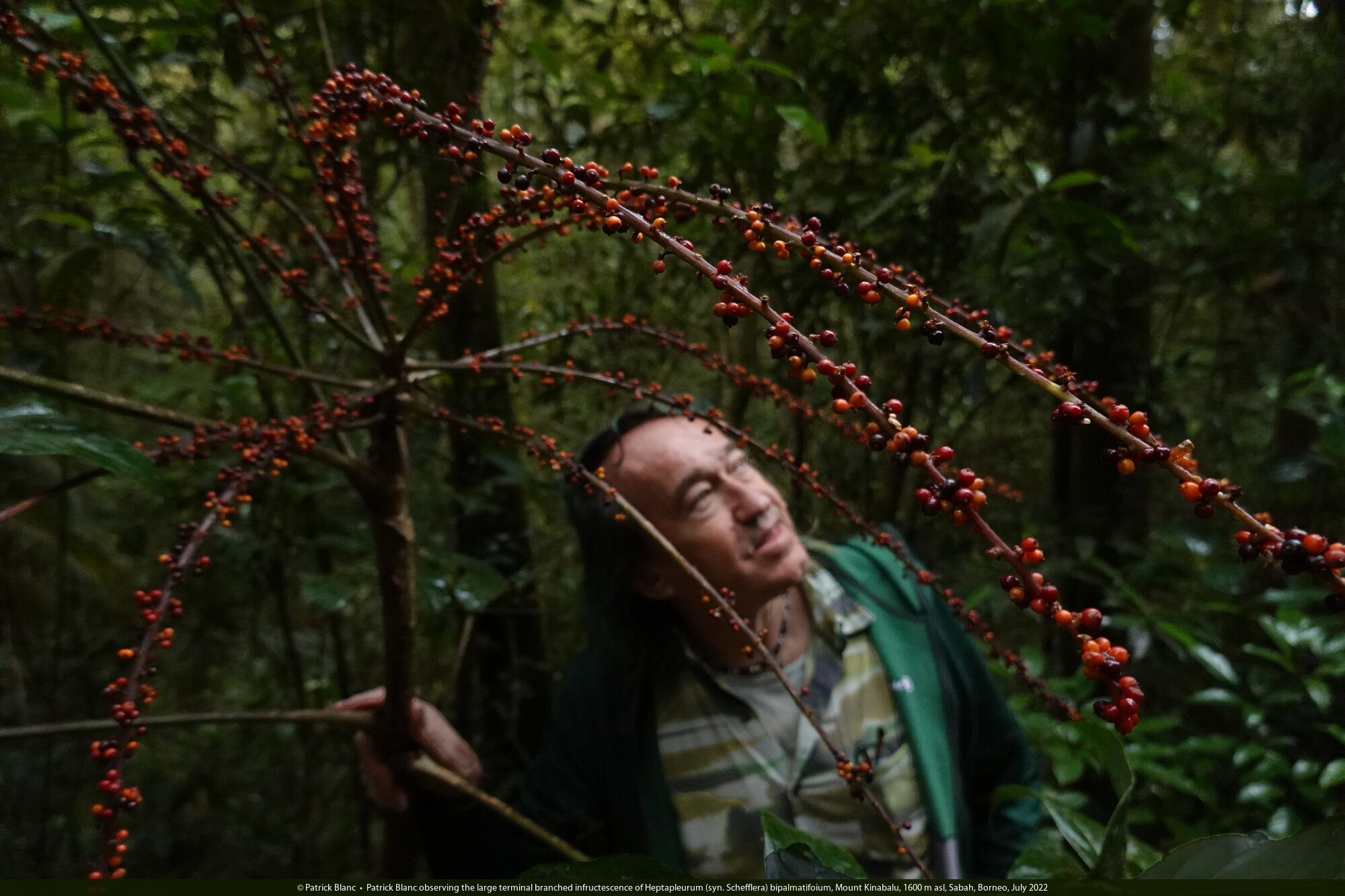 Patrick Blanc observing the large terminal branched infructescence of Heptapleurum (syn. Schefflera) bipalmatifoium, Mount Kinabalu, 1600 m asl, Sabah, Borneo, July 2022