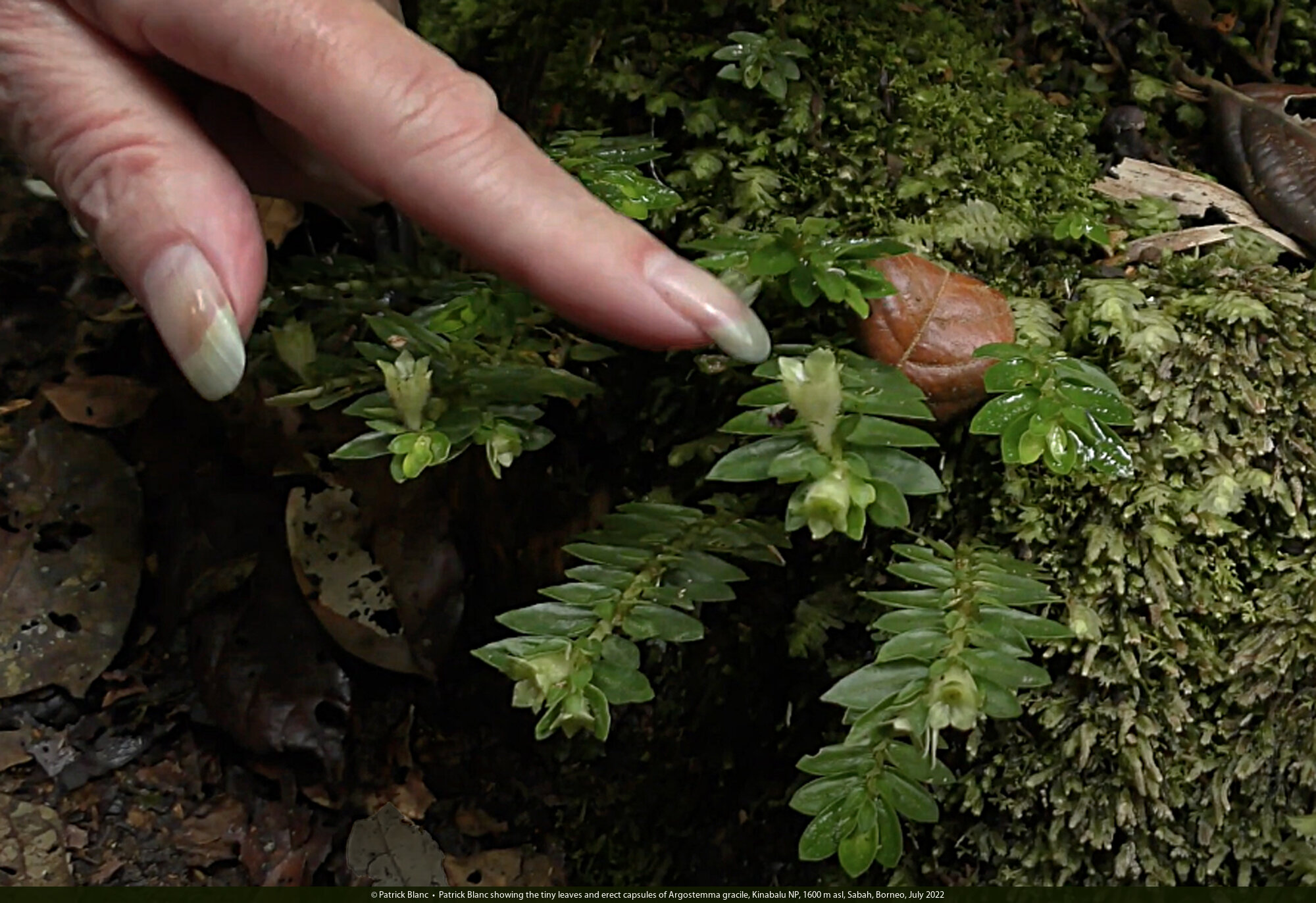 Patrick Blanc showing the tiny leaves and erect capsules of Argostemma gracile, Kinabalu NP, 1600 m asl, Sabah, Borneo, July 2022