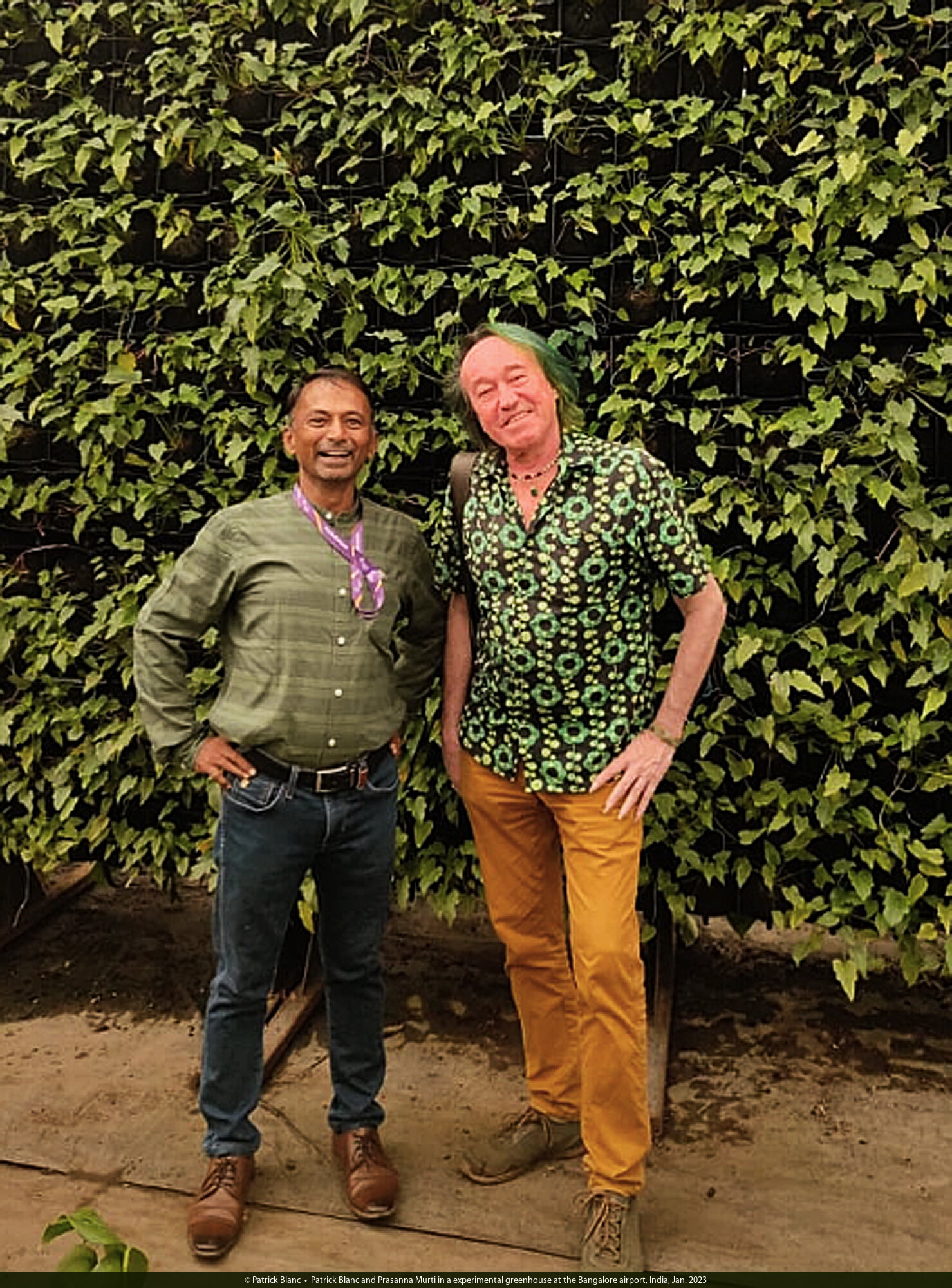 Patrick Blanc and Prasanna Murti in a experimental greenhouse at the Bangalore airport, India, Jan. 2023