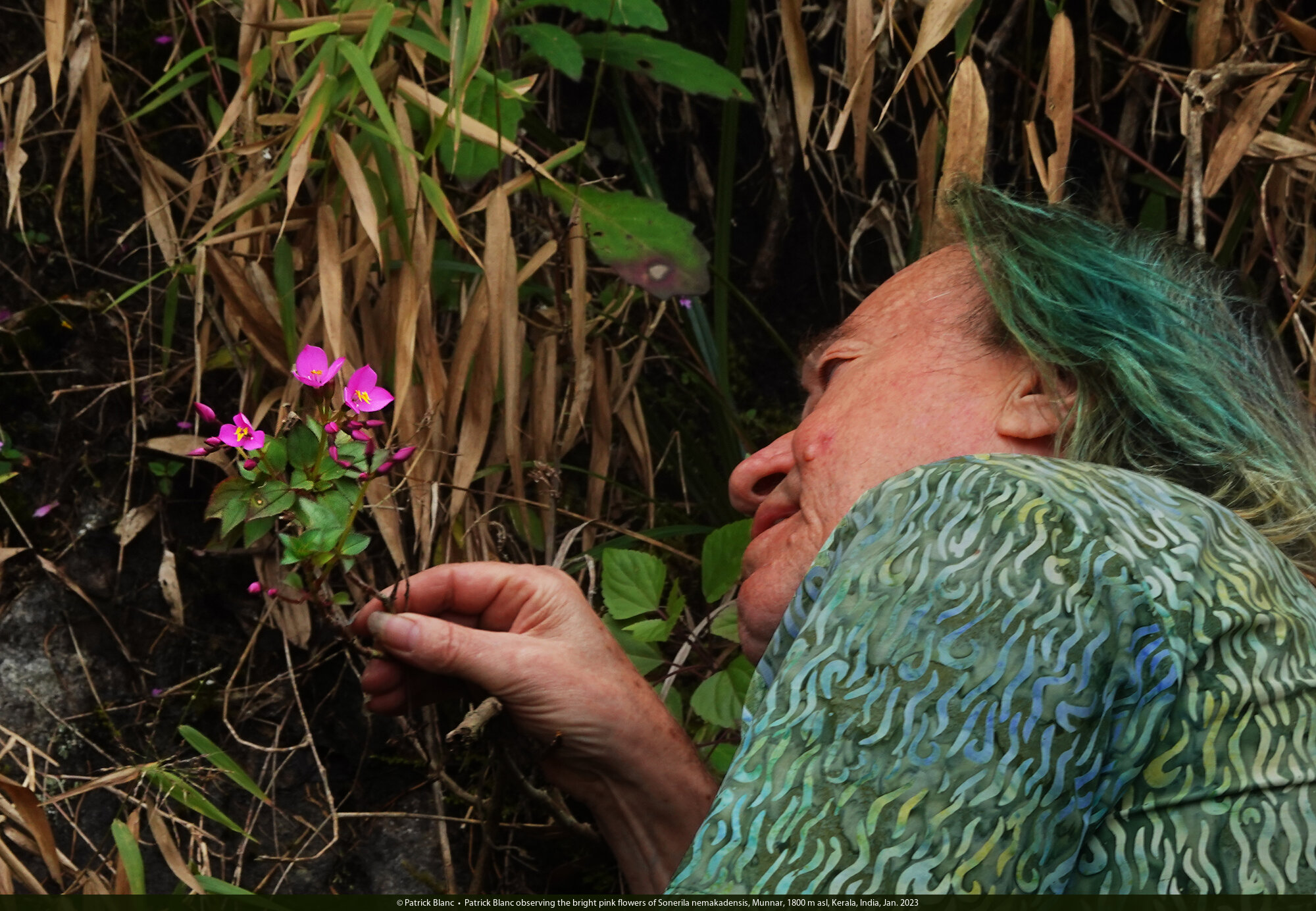 Patrick Blanc observing the bright pink flowers of Sonerila nemakadensis, Munnar, 1800 m asl, Kerala, India, Jan. 2023