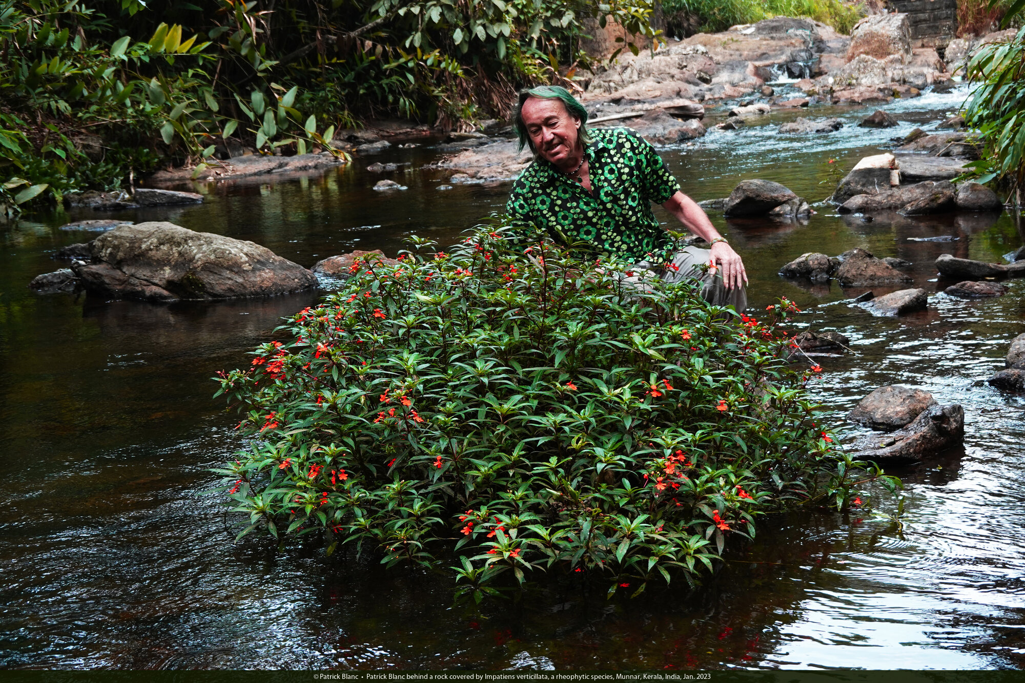 Patrick Blanc in a fast flowing stream bed among rocks covered by the rheophytic Impatiens verticillata, Munnar, Kerala, India, Jan. 2023