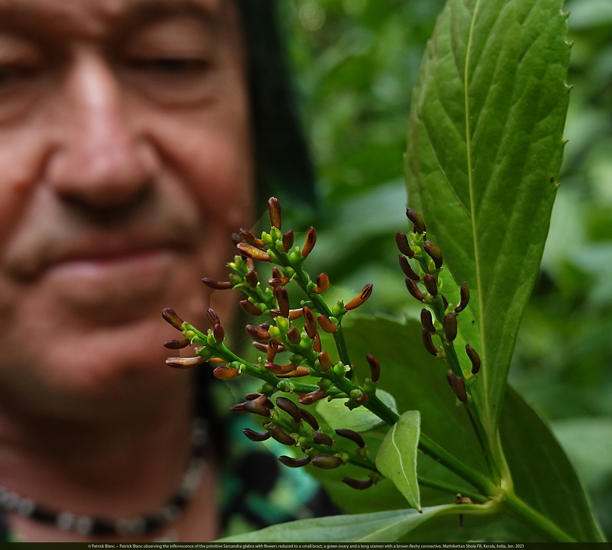 Patrick Blanc observing the inflorescence of the primitive Sarcandra glabra with flowers reduced to a small bract, a green ovary and a long stamen with a brown fleshy connective, Mathikettan Shola FR, Kerala, India, Jan. 2023