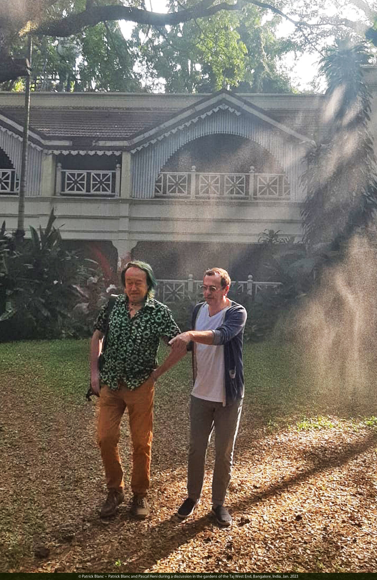 Patrick Blanc and Pascal Heni during a discussion in the gardens of the Taj West End, Bangalore, India, Jan. 2023