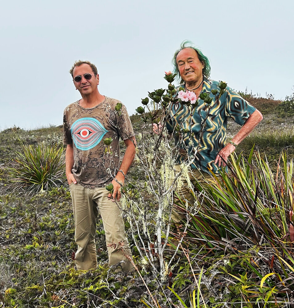 Patrick Blanc and Pascal Héni behind a pink form of Rhododendron asperum, Anggi Lakes, 2300 m asl, Arfak Mts, West Papua, May 2025