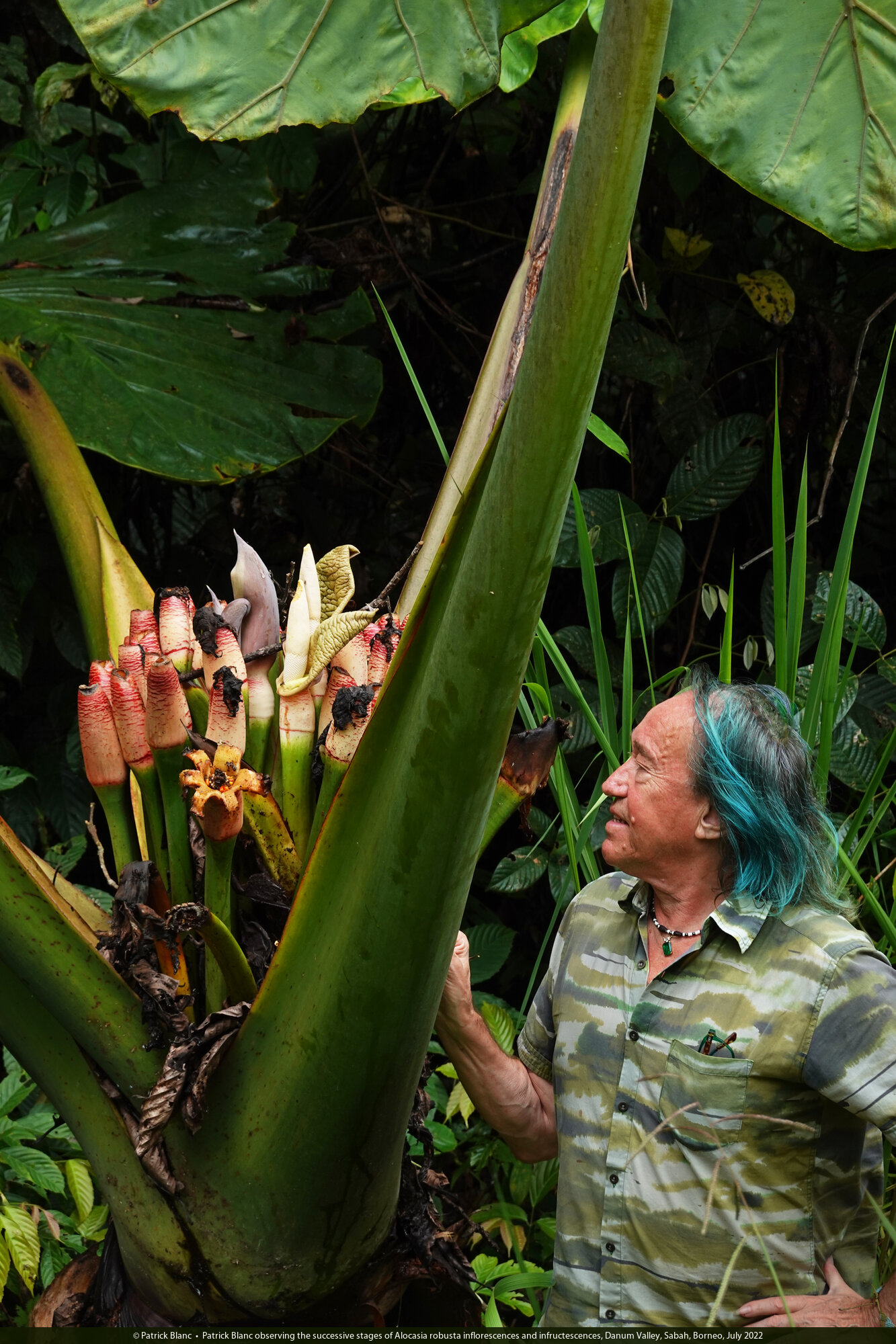 Patrick Blanc observing the successive stages of Alocasia robusta inflorescences and infructescences, Danum Valley, Sabah, Borneo, July 2022