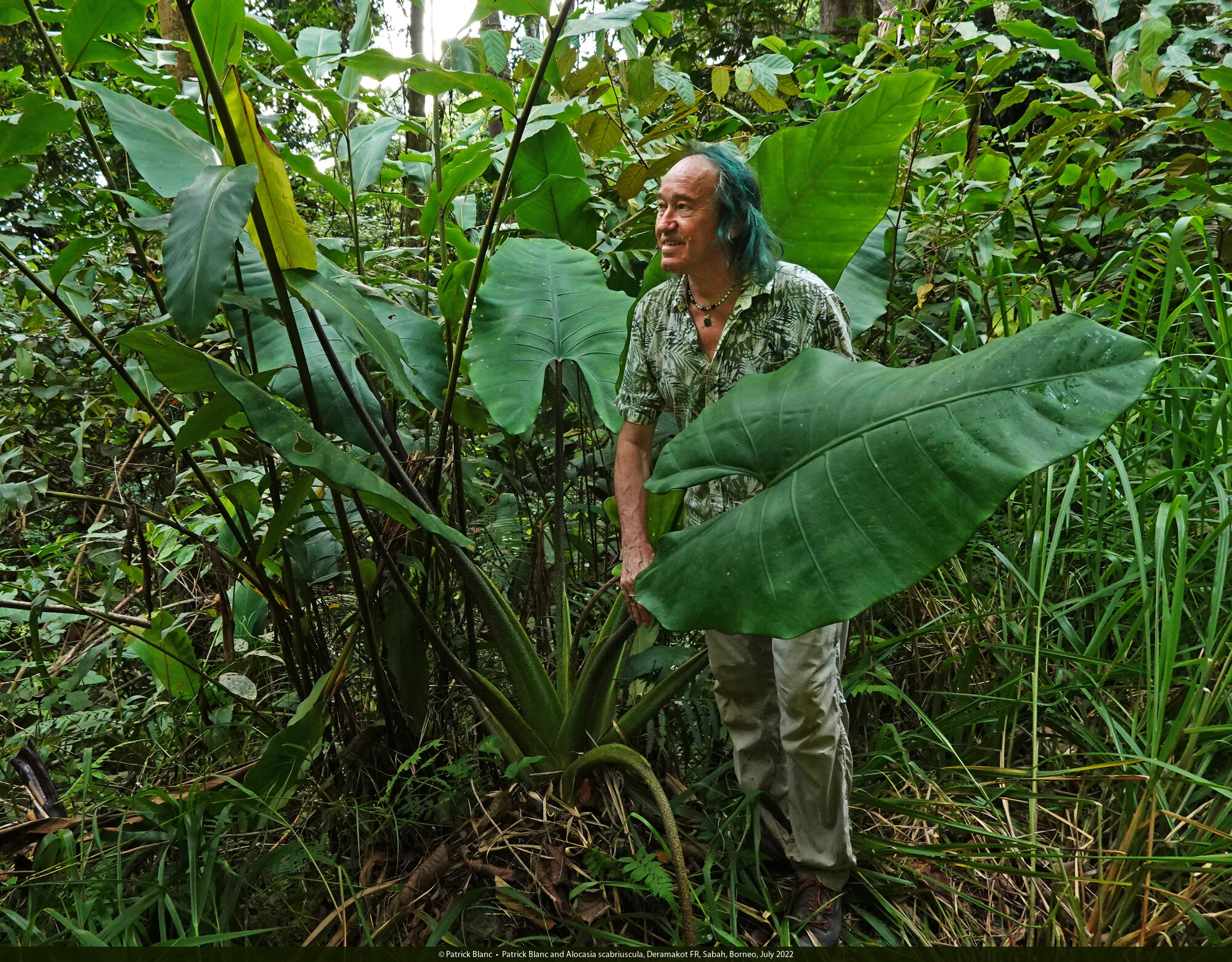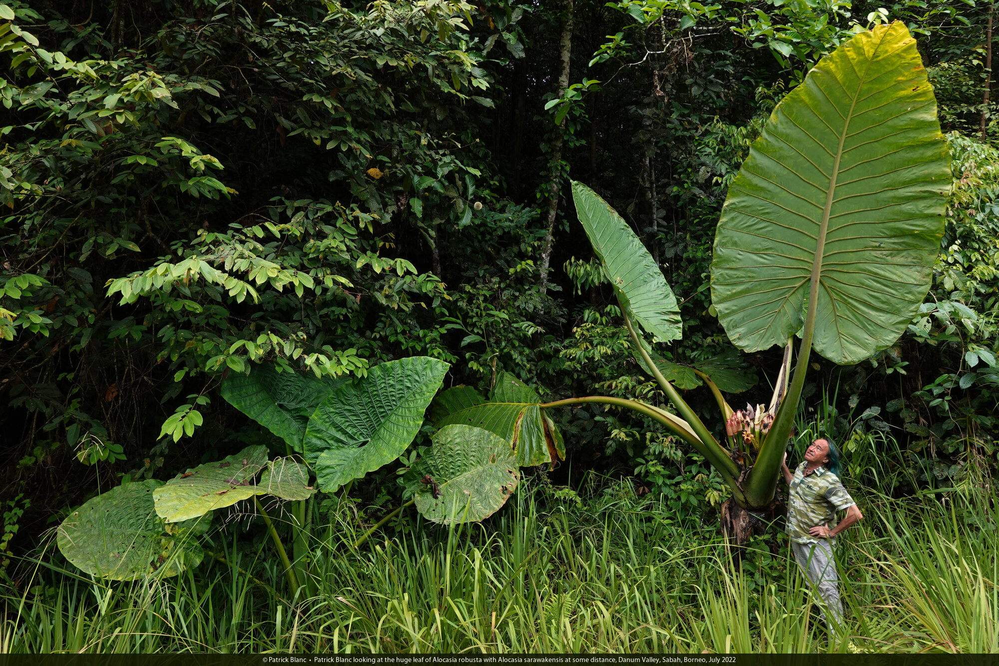 Patrick Blanc and a huge Alocasia cf. princeps, the leaf reaching 2,30 m in total length, Sukau, Kinabatangan, Sabah, Borneo, July 2022