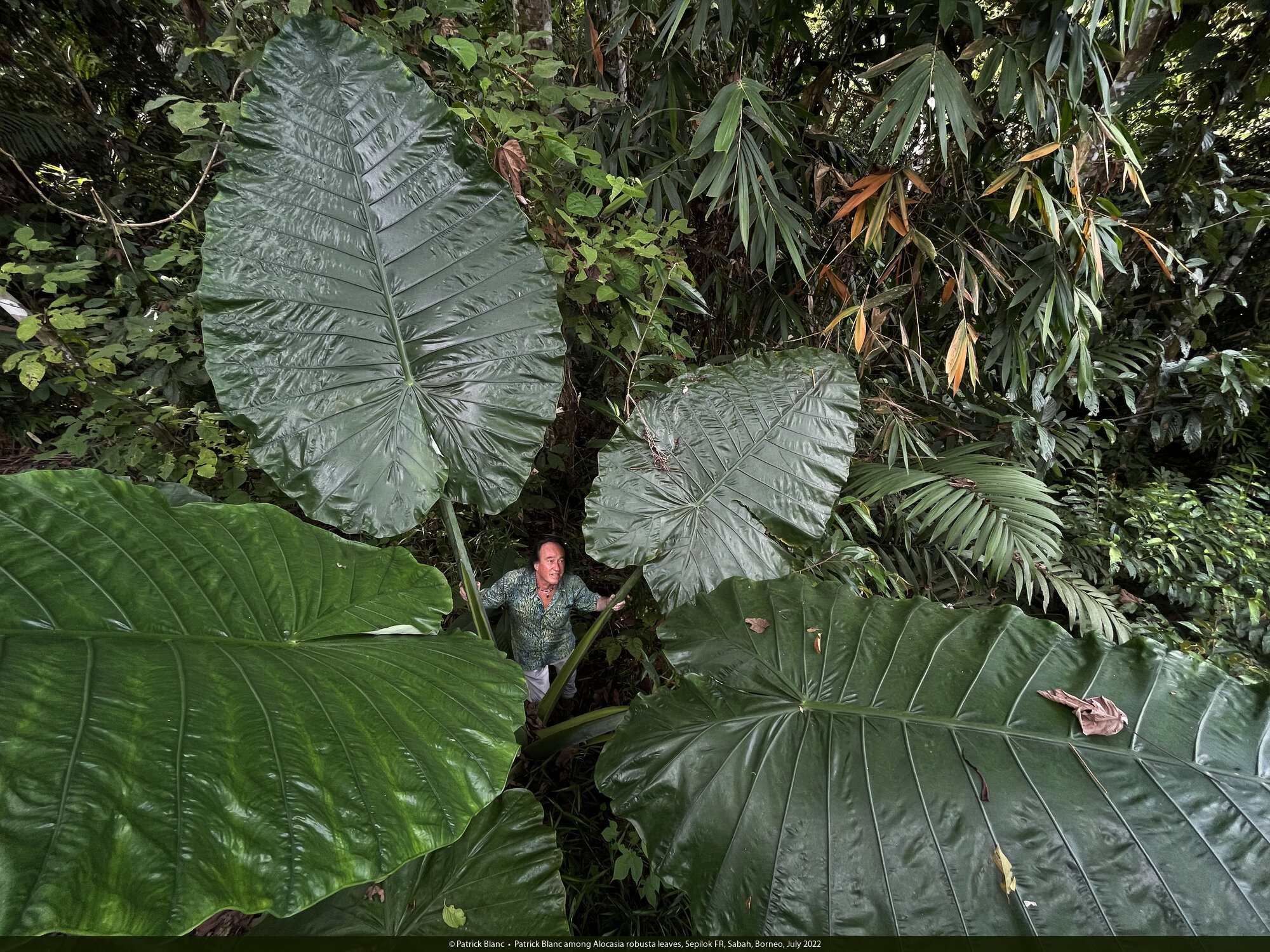 Patrick Blanc among Alocasia robusta leaves, Sepilok FR, Sabah, Borneo, July 2022