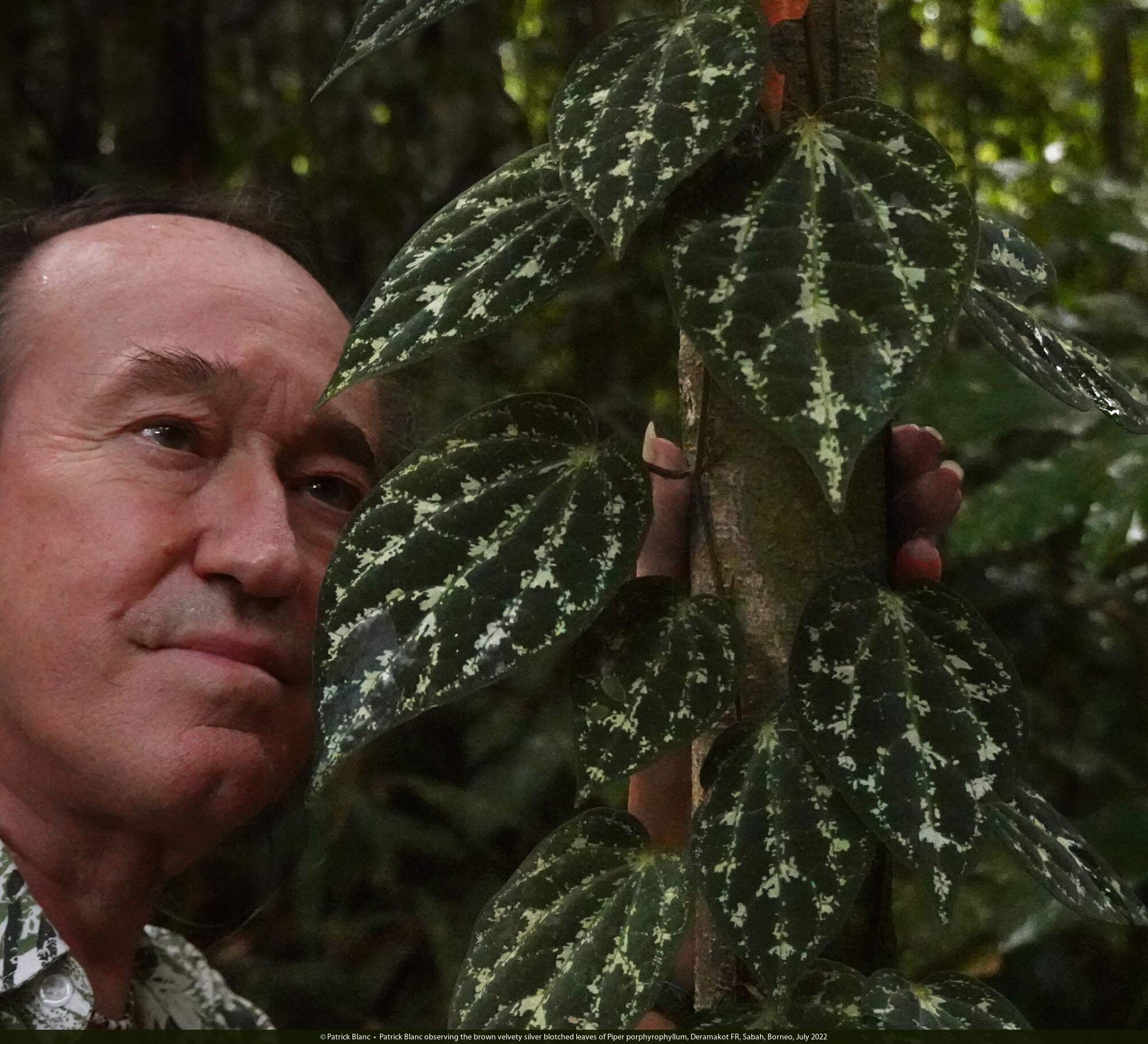 Patrick Blanc observing the brown velvety silver blotched leaves of Piper porphyrophyllum, Deramakot FR, Sabah, Borneo, July 2022