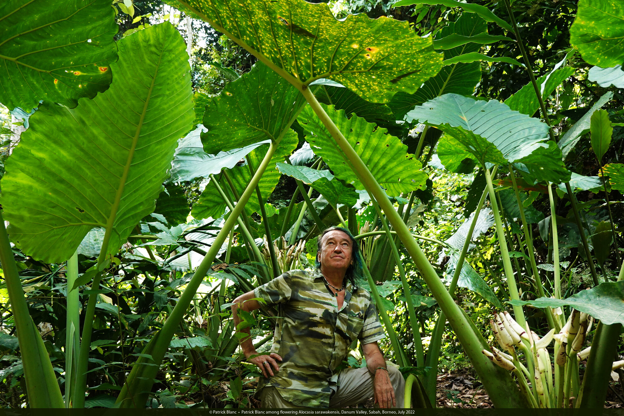 Patrick Blanc among flowering Alocasia sarawakensis, Danum Valley, Sabah, Borneo, July 2022