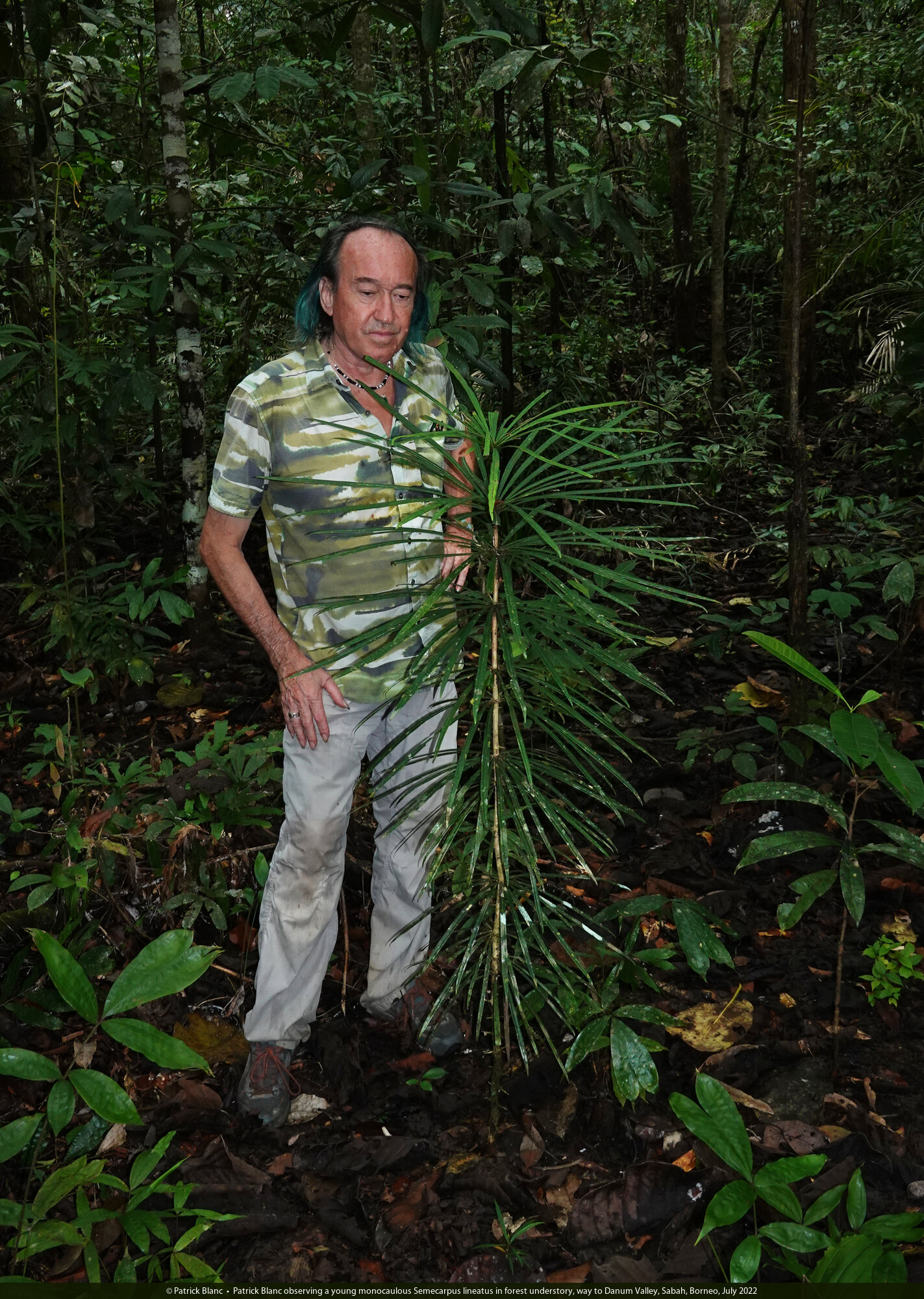 Patrick Blanc observing a young monocaulous Semecarpus lineatus in forest understory, way to Danum Valley, Sabah, Borneo, July 2022