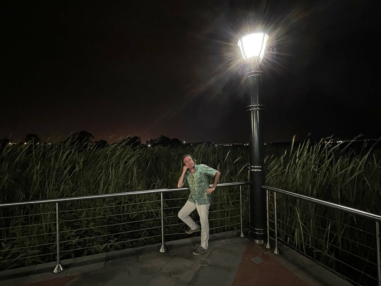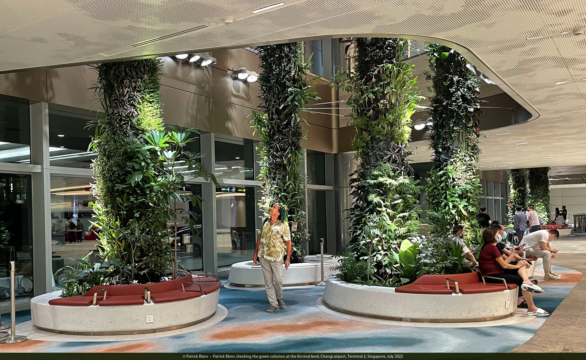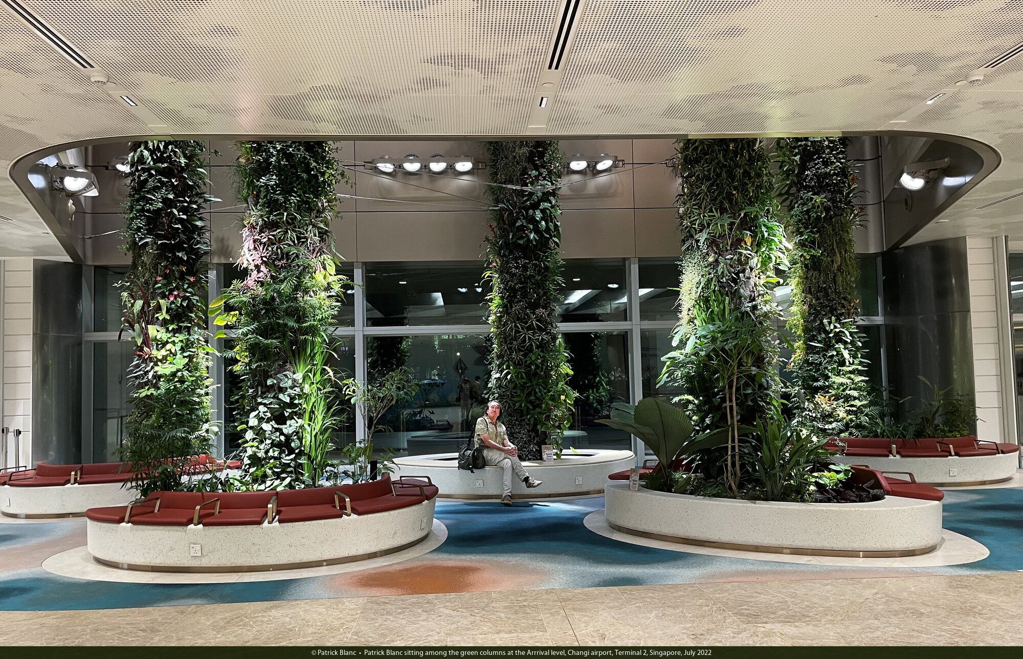 Patrick Blanc sitting among the green columns at the Arrrival level, Changi airport, Terminal 2, Singapore, July 2022