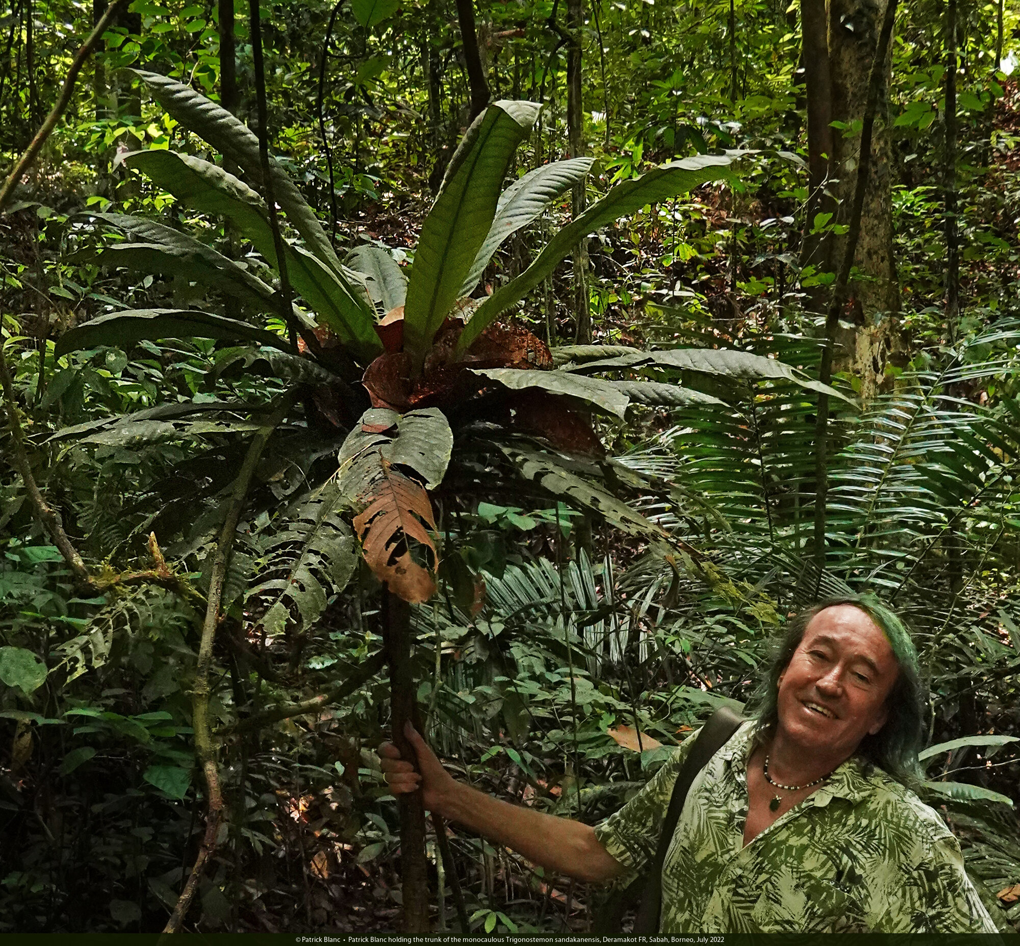 Patrick Blanc holding the trunk of the monocaulous Trigonostemon sandakanensis, Deramakot FR, Sabah, Borneo, July 2022