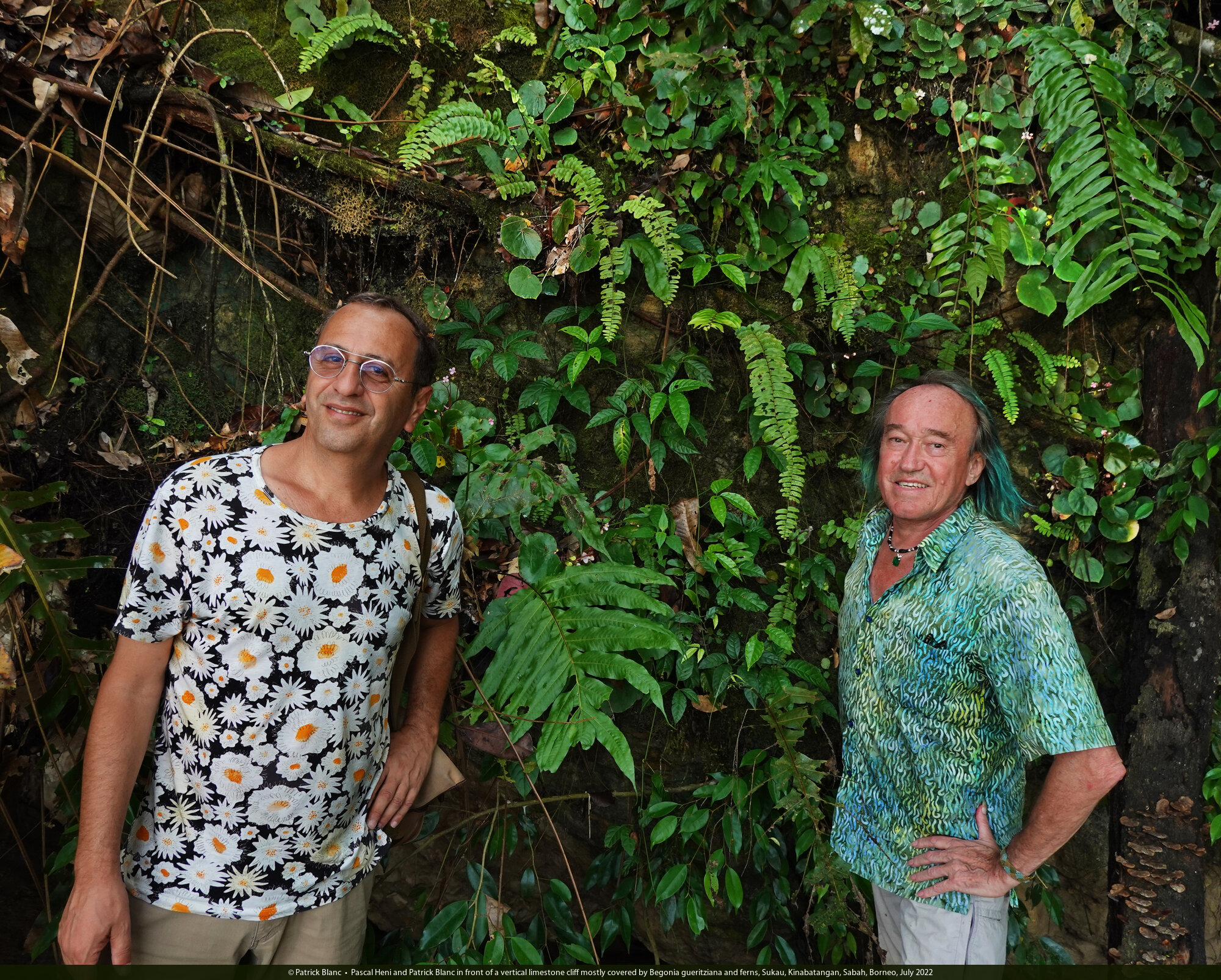 Pascal Heni and Patrick Blanc in front of a vertical limestone cliff mostly covered by Begonia gueritziana and ferns, Sukau, Kinabatangan, Sabah, Borneo, July 2022