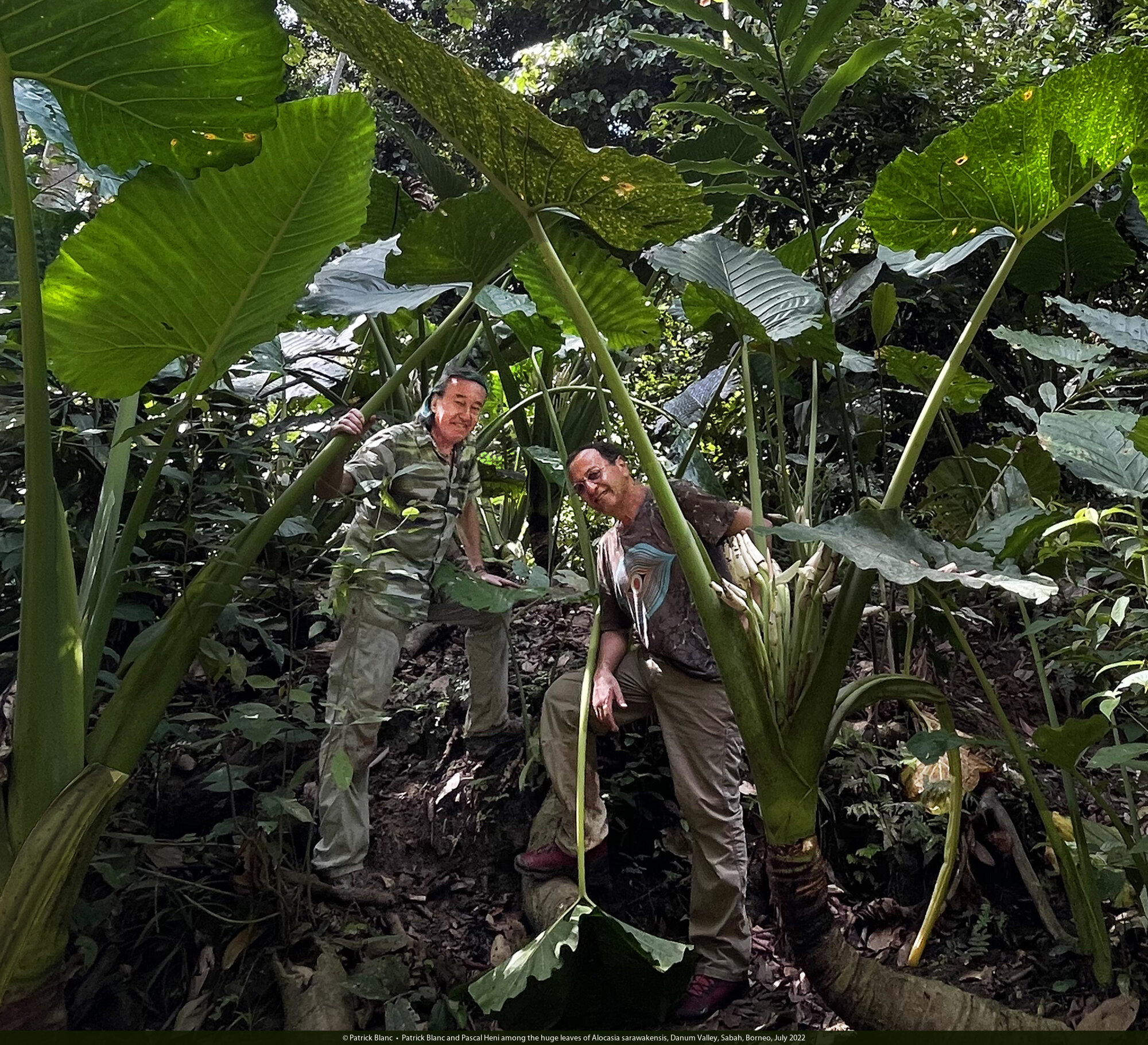 Patrick Blanc and Pascal Heni among the huge leaves of Alocasia sarawakensis, Danum Valley, Sabah, Borneo, July 2022