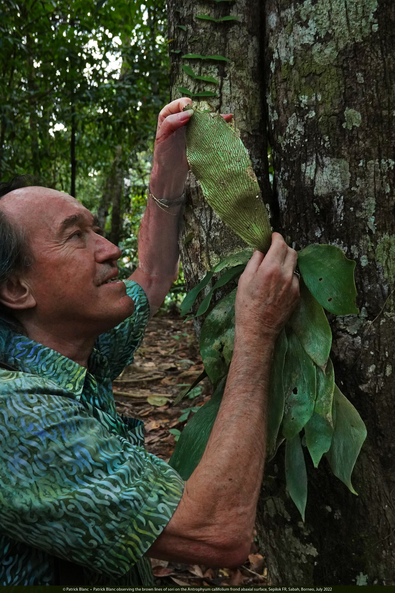 Patrick Blanc observing the brown lines of sori on the Antrophyum callifolium frond abaxial surface, Sepilok FR, Sabah, Borneo, July 2022