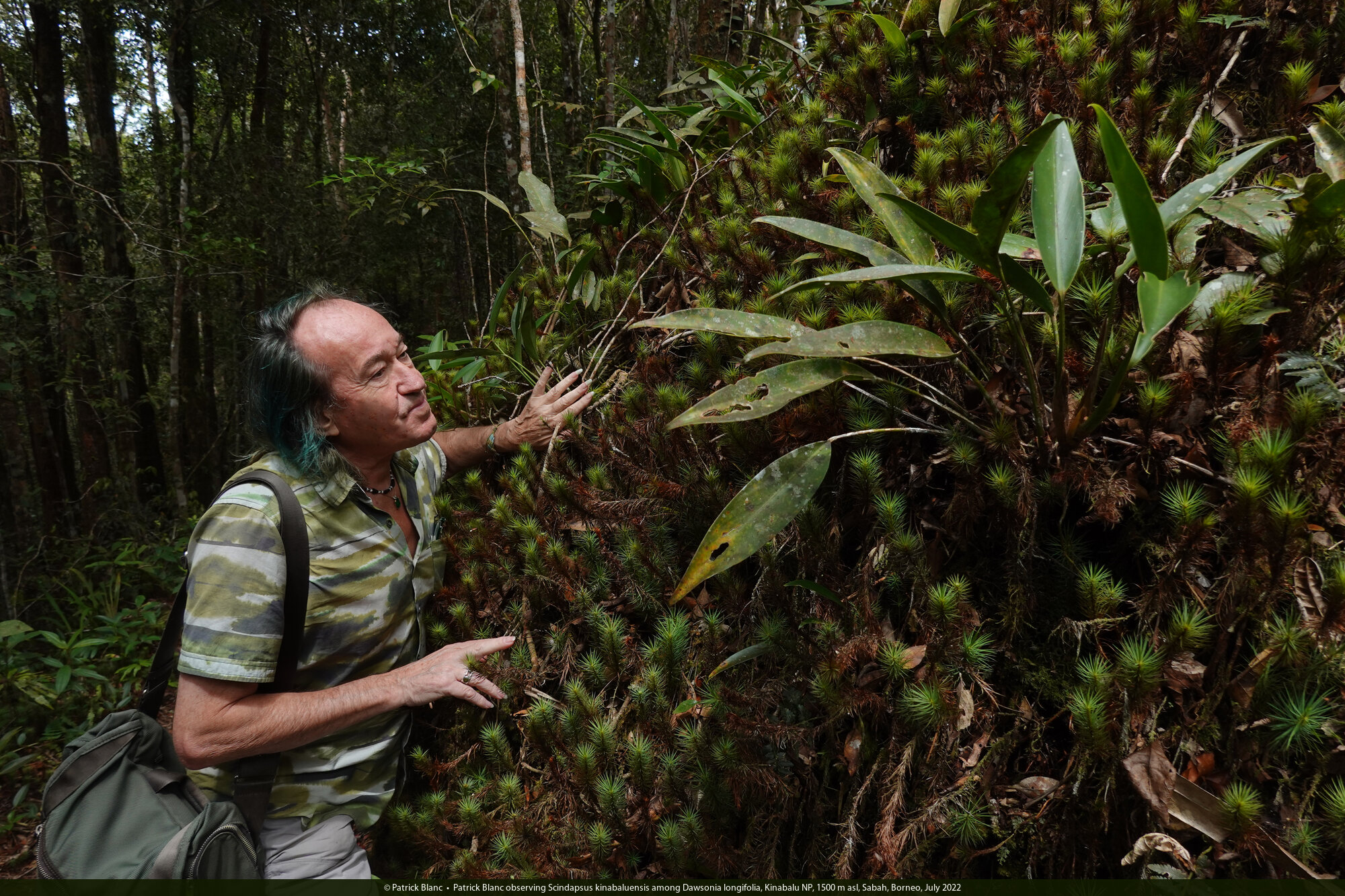 Patrick Blanc observing Scindapsus kinabaluensis among Dawsonia longifolia, Kinabalu NP, 1500 m asl, Sabah, Borneo, July 2022