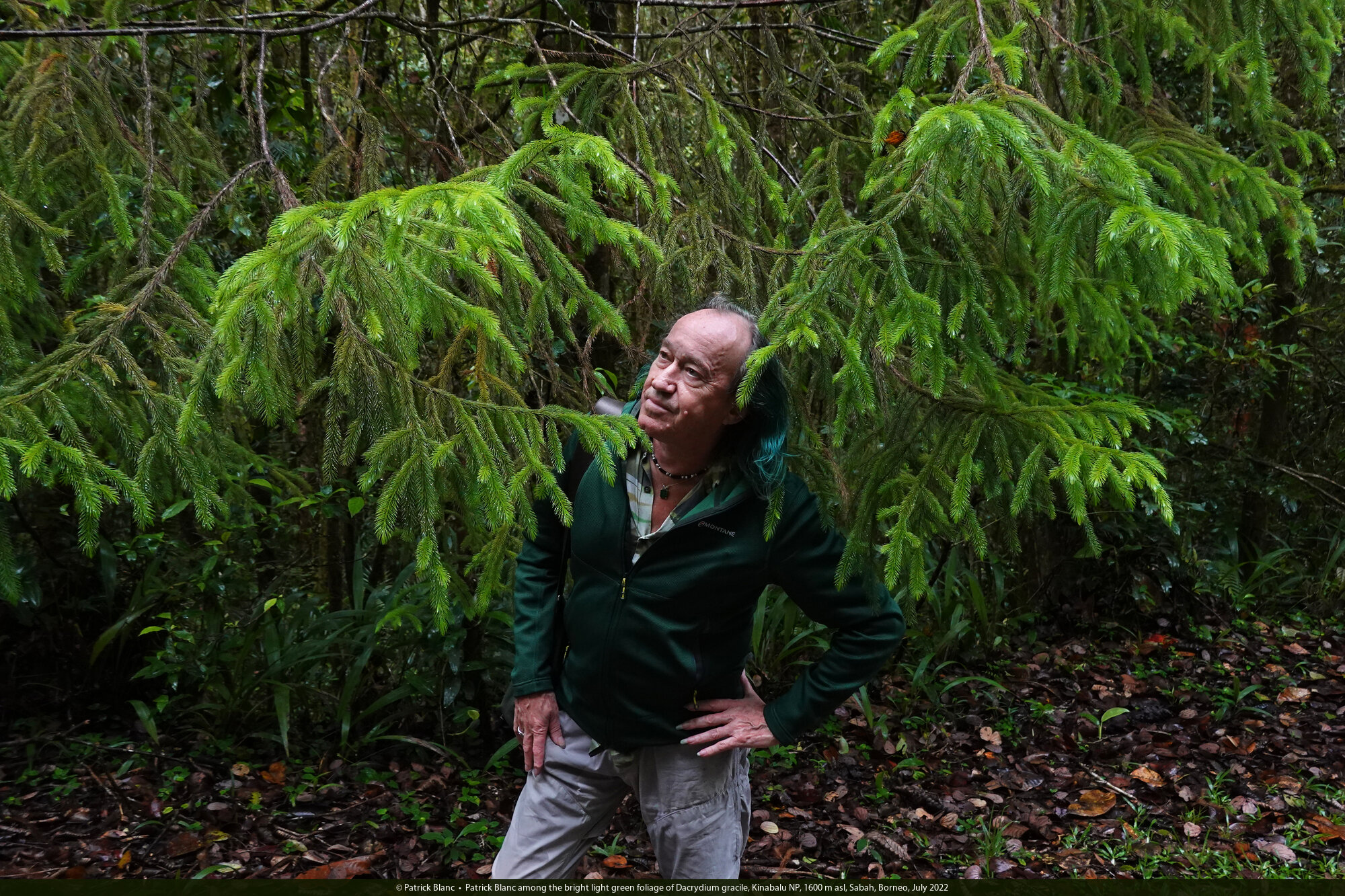 Patrick Blanc among the bright light green foliage of Dacrydium gracile, Kinabalu NP, 1600 m asl, Sabah, Borneo, July 2022