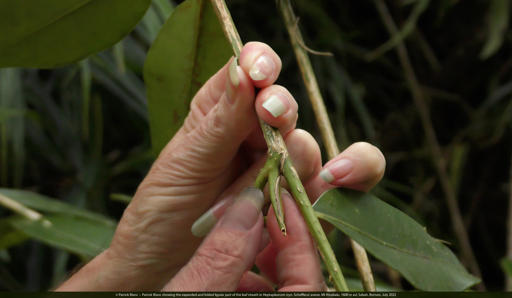 Patrick Blanc showing the expanded and folded ligular part of the leaf sheath in Heptapleurum (syn. Schefflera) avene, Mt Kinabalu, 1600 m asl, Sabah, Borneo, July 2022