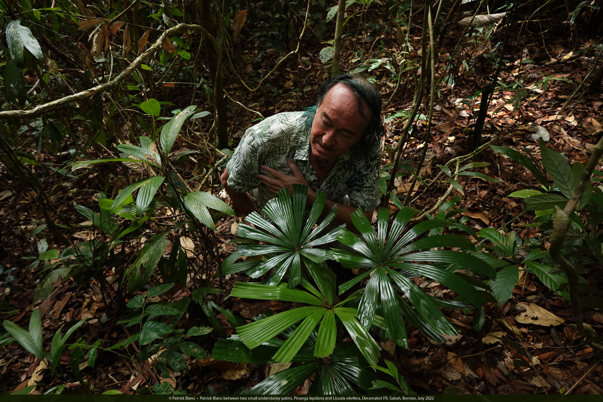 Patrick Blanc between two small understorey palms, Pinanga lepidota and Licuala olivifera, Deramakot FR, Sabah, Borneo, July 2022