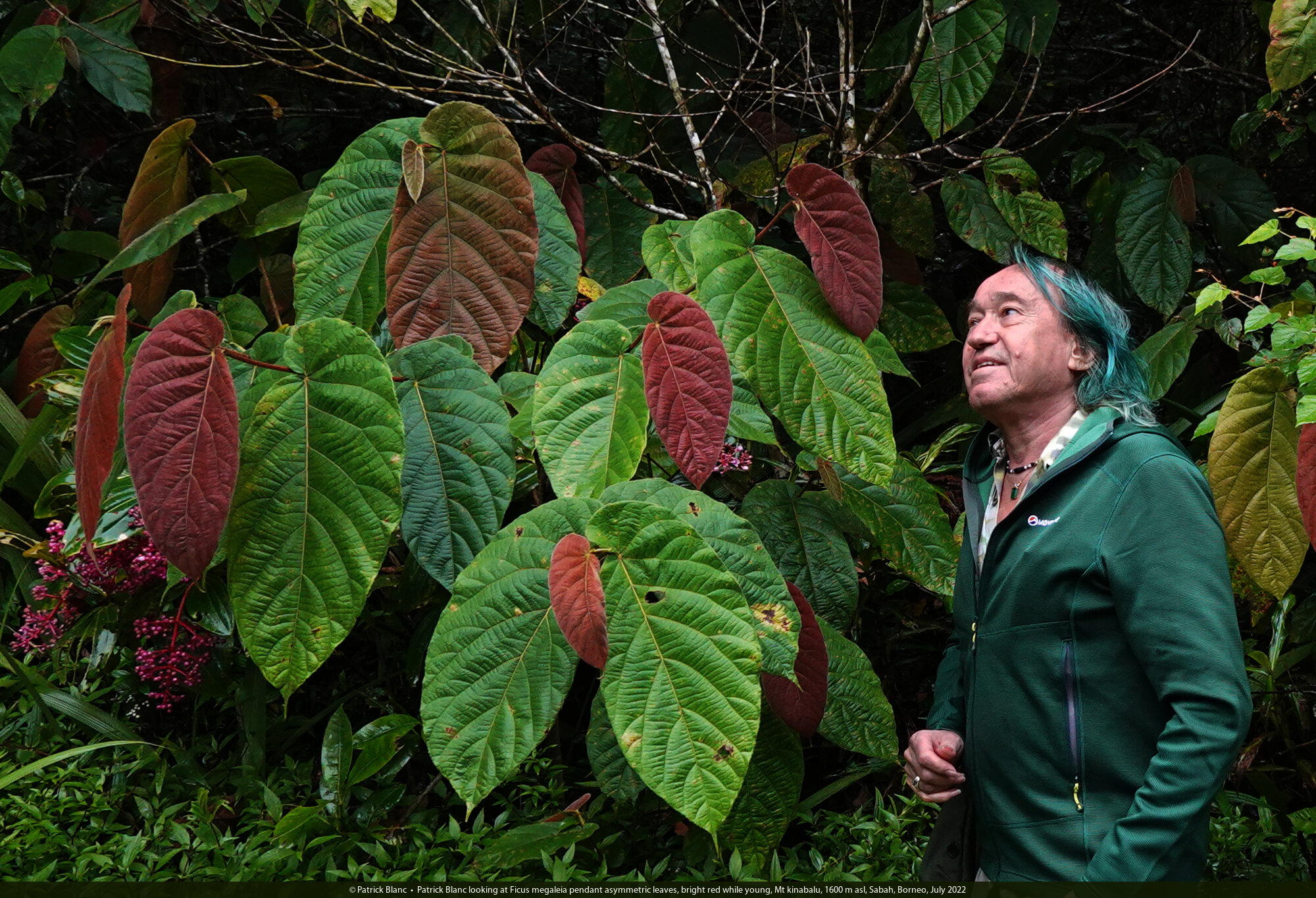 Patrick Blanc looking at Ficus megaleia pendant asymmetric leaves, bright red while young, Mt kinabalu, 1600 m asl, Sabah, Borneo, July 2022