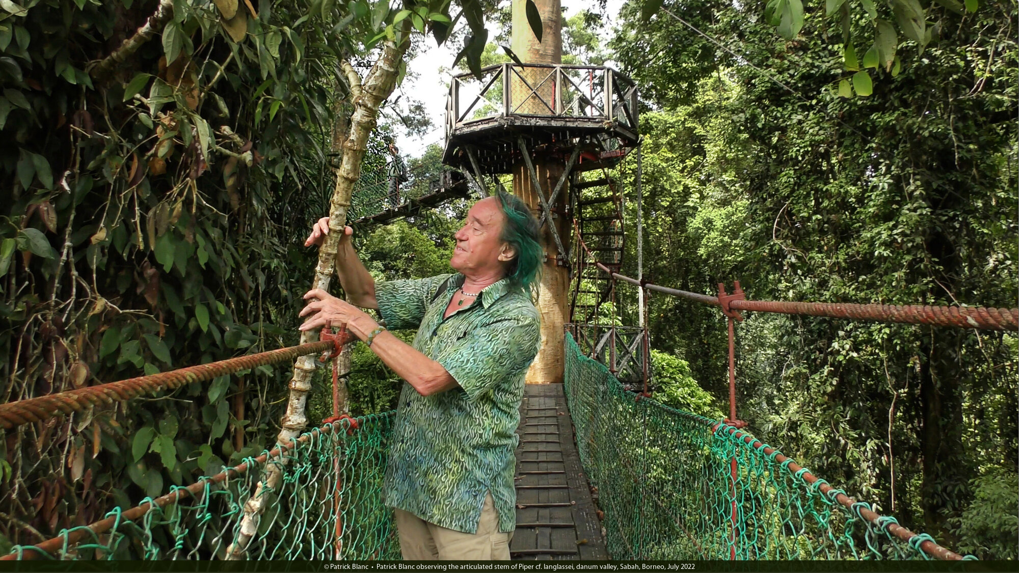 Patrick Blanc observing the articulated stem of Piper cf. langlassei, danum valley, Sabah, Borneo, July 2022