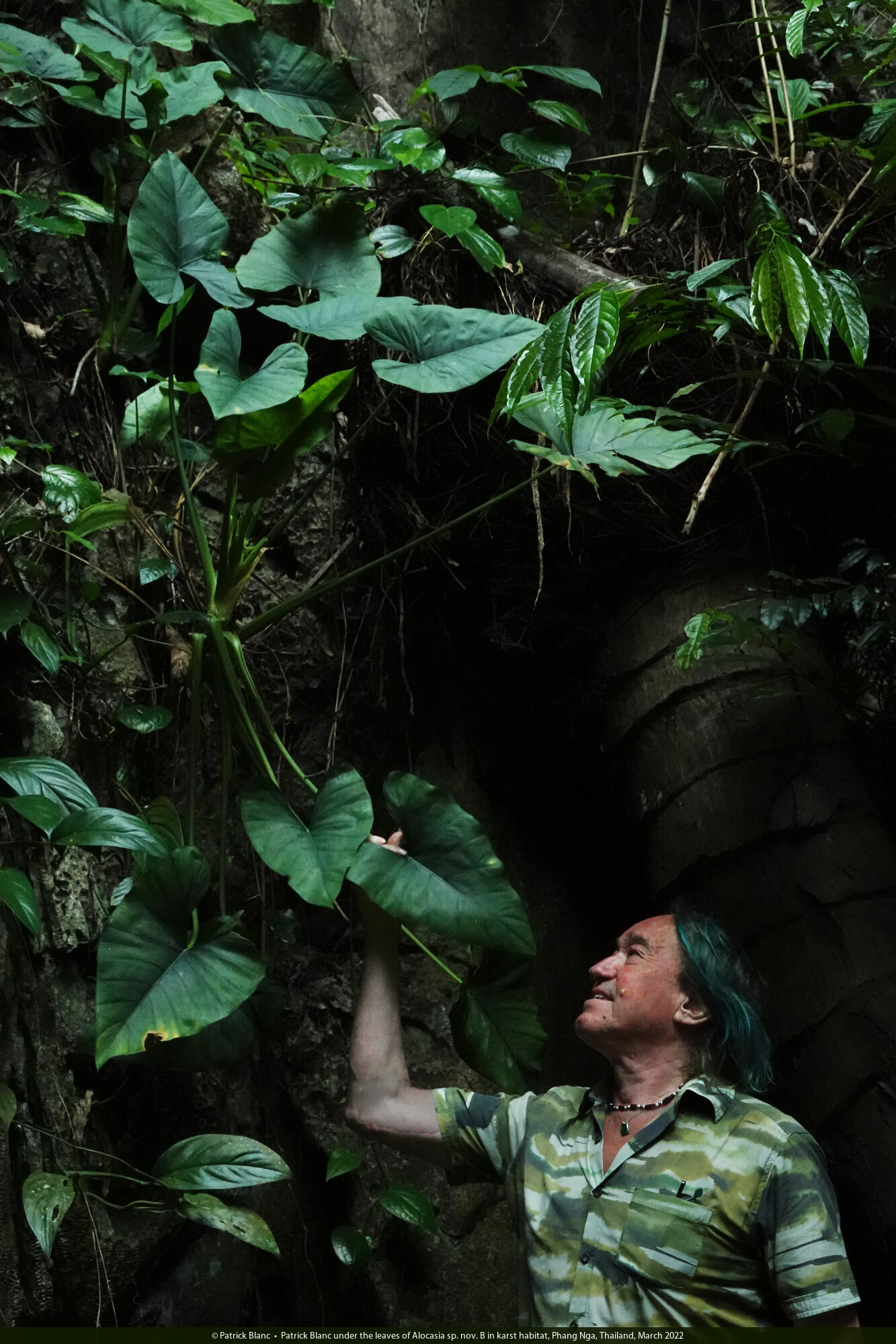 Patrick Blanc under the leaves of Alocasia sp. nov. B in karst habitat, Phang Nga, Thailand, March 2022