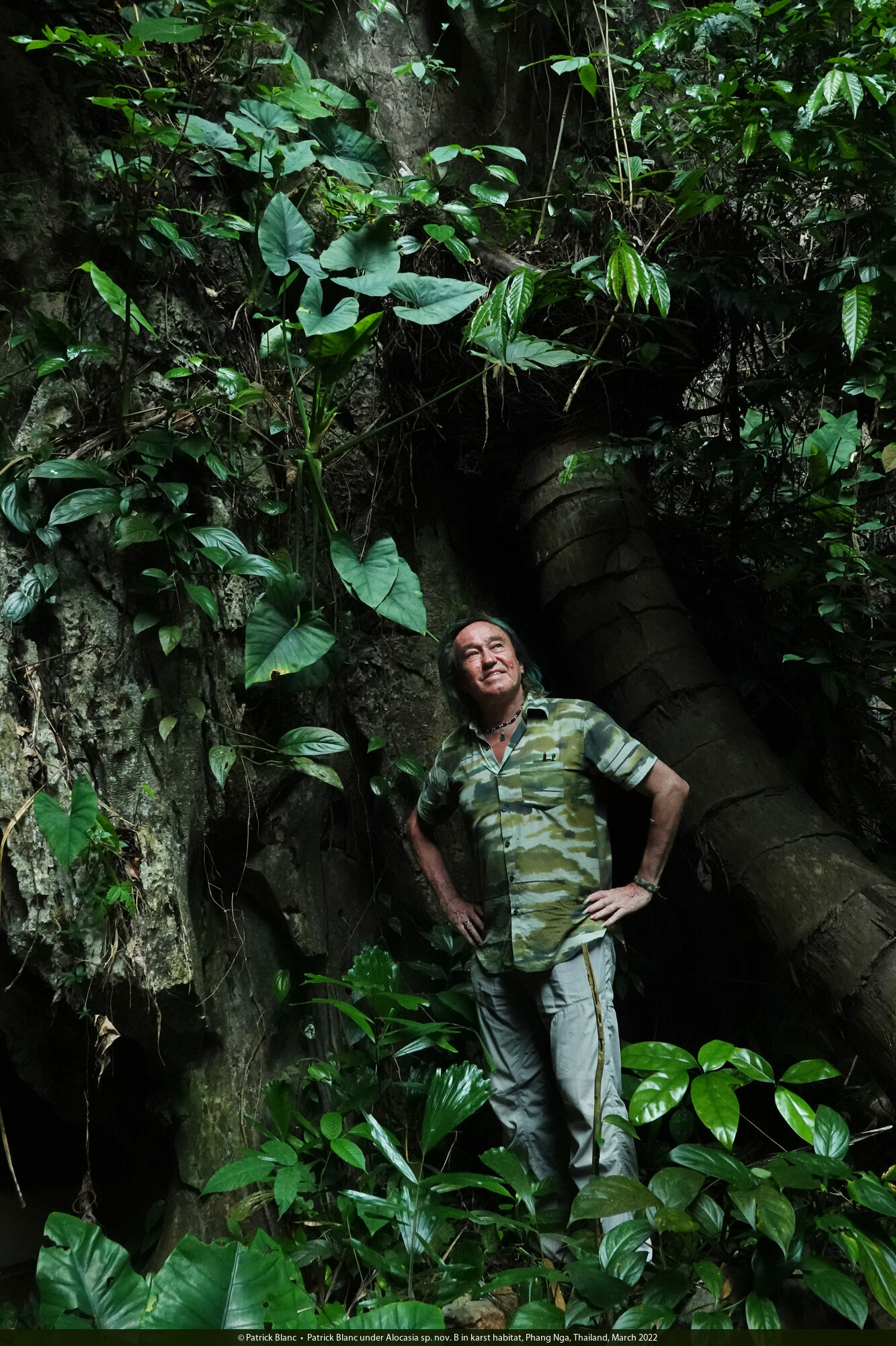 Patrick Blanc under Alocasia sp. nov. B in karst habitat, Phang Nga, Thailand, March 2022