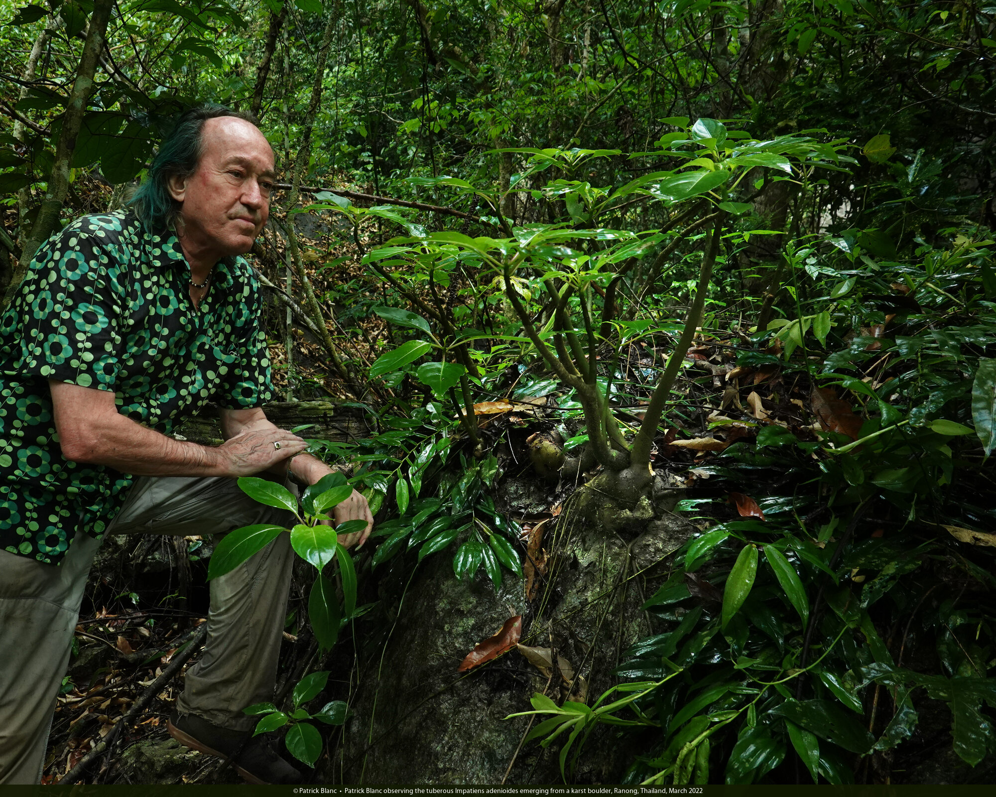 Patrick Blanc observing the tuberous Impatiens adenioides emerging from a karst boulder, Ranong, Thailand, March 2022