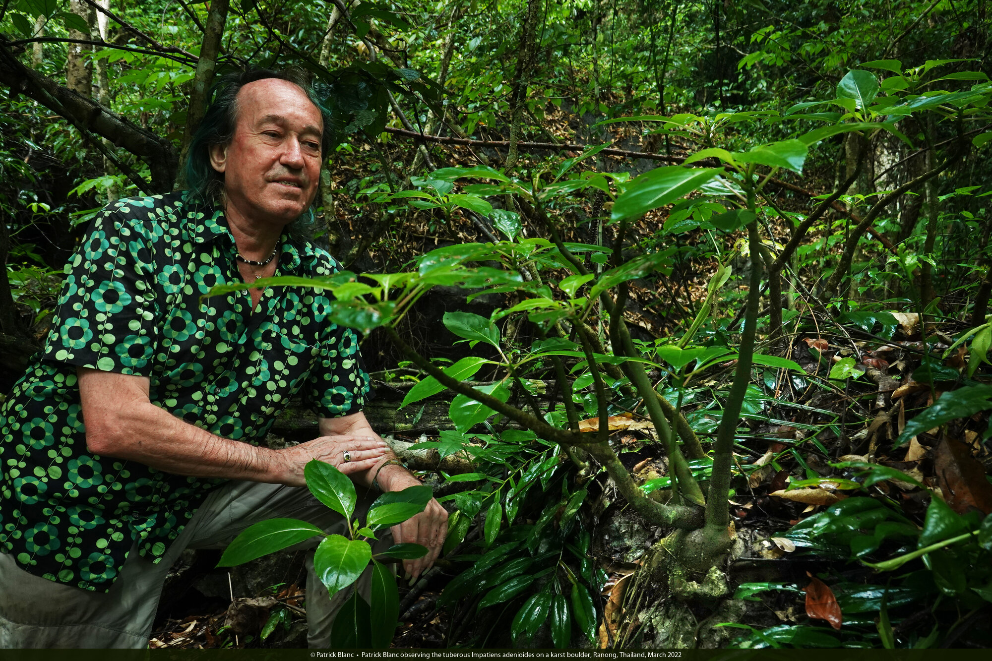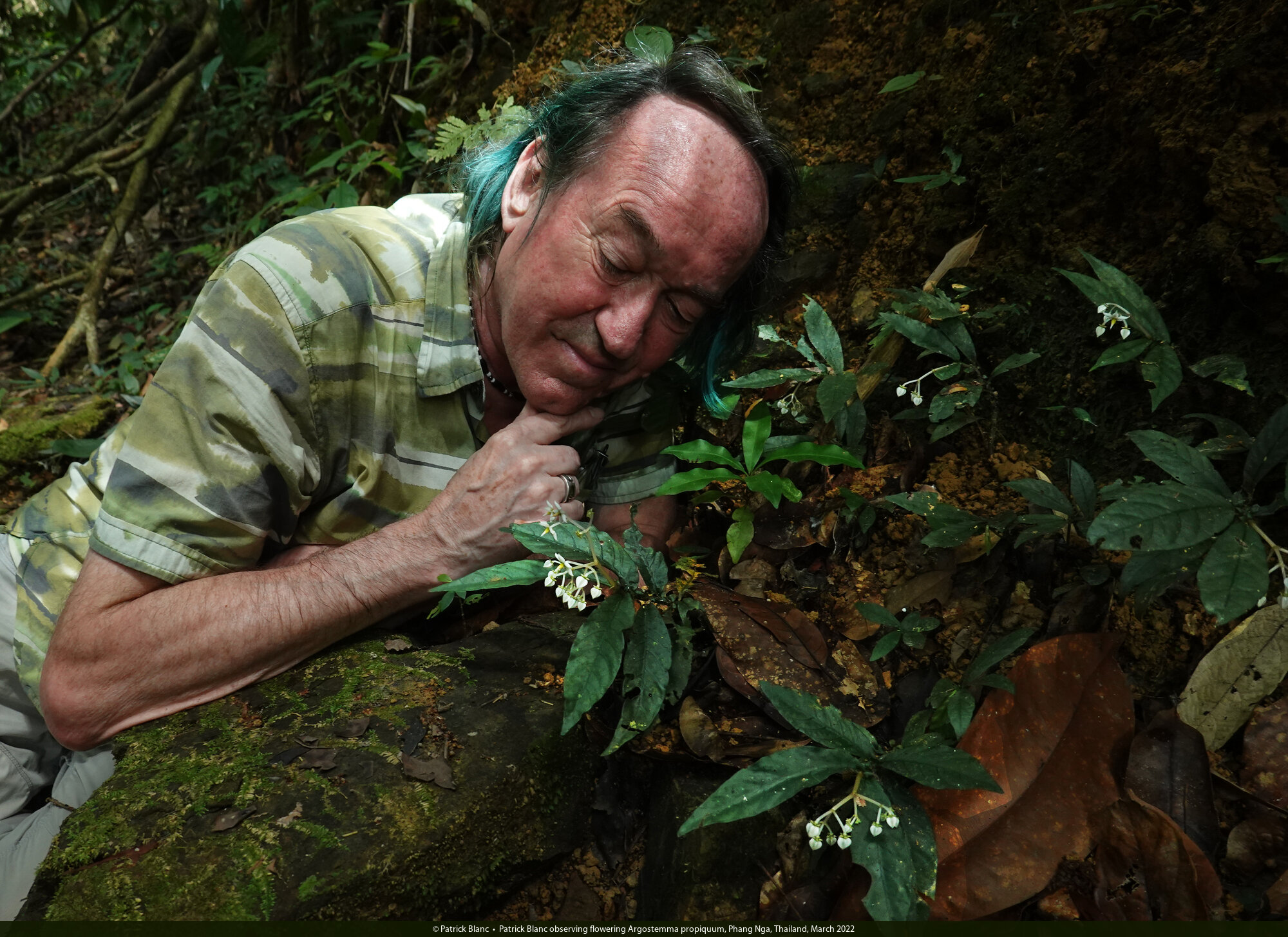 Patrick Blanc observing a blooming Codonoboea platypus, Phang Nga, Thailand, March 2022