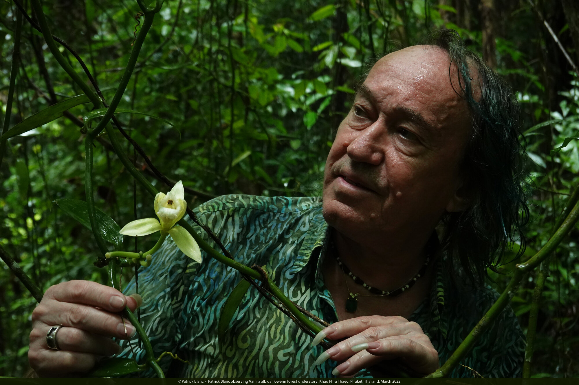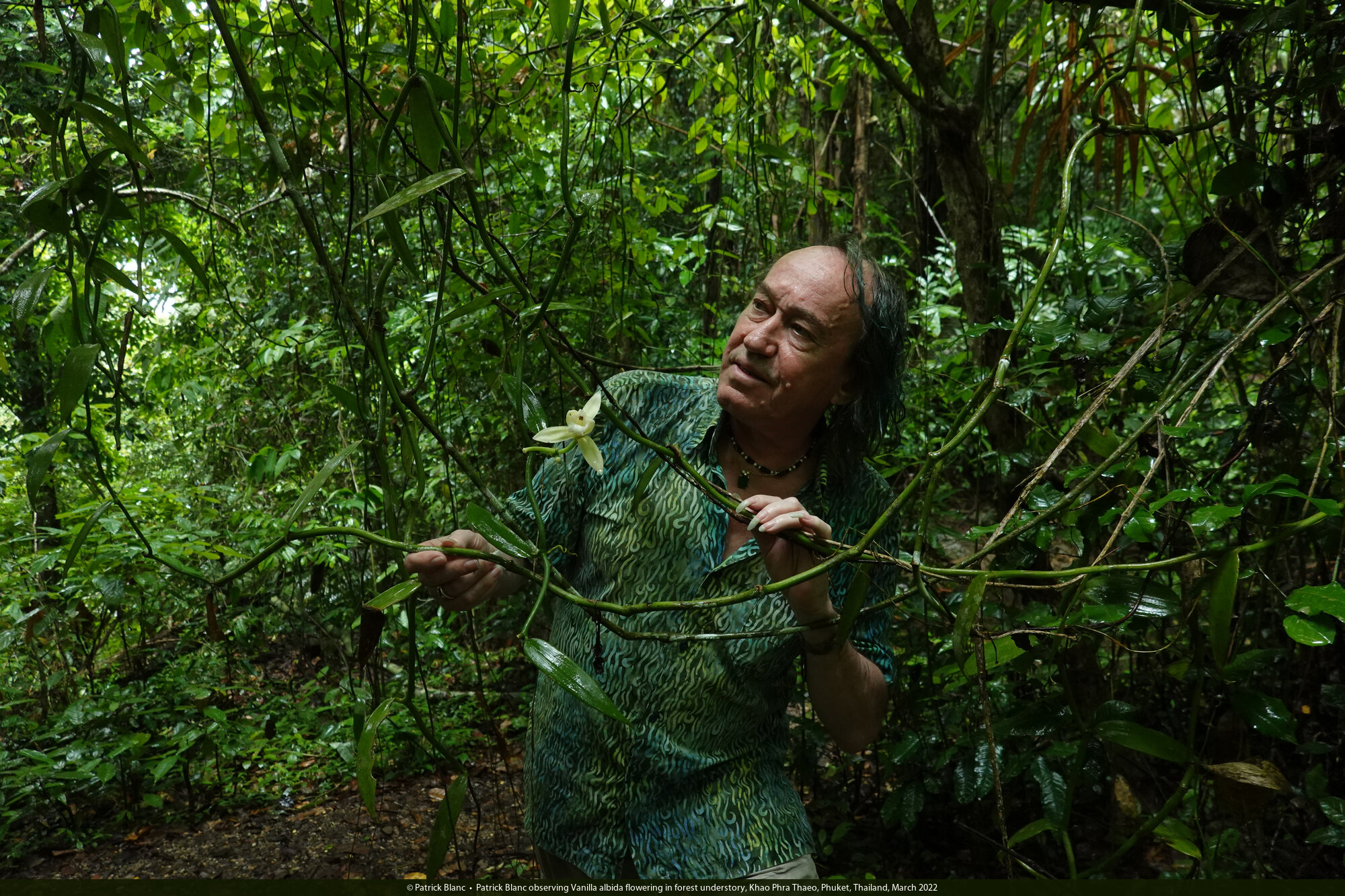 Patrick Blanc observing Vanilla albida flowerin forest understory, Khao Phra Thaeo, Phuket, Thailand, March 2022