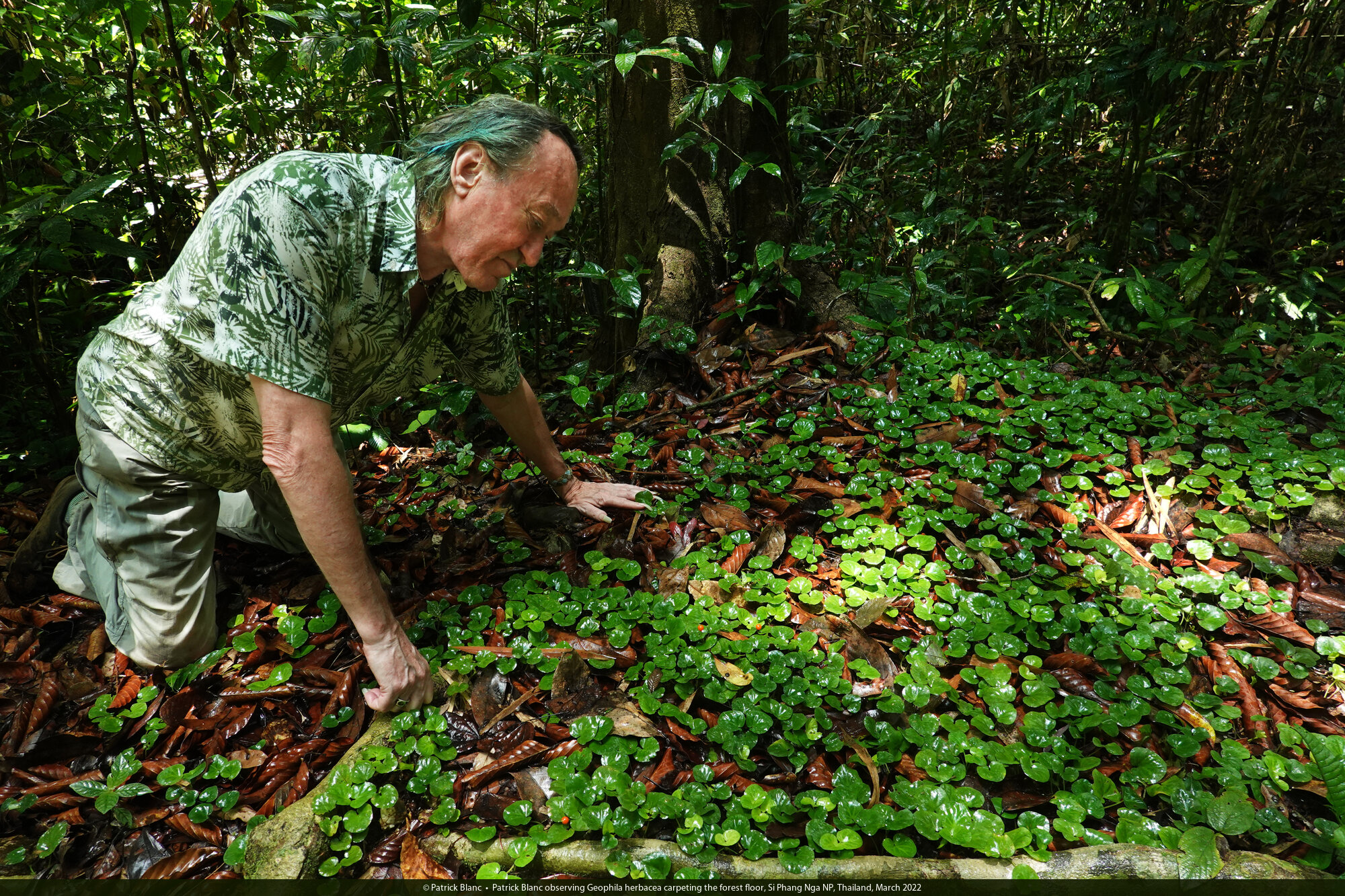Patrick Blanc observing Geophila herbacea carpeting the forest floor, Si Phang Nga NP, Thailand, March 2022