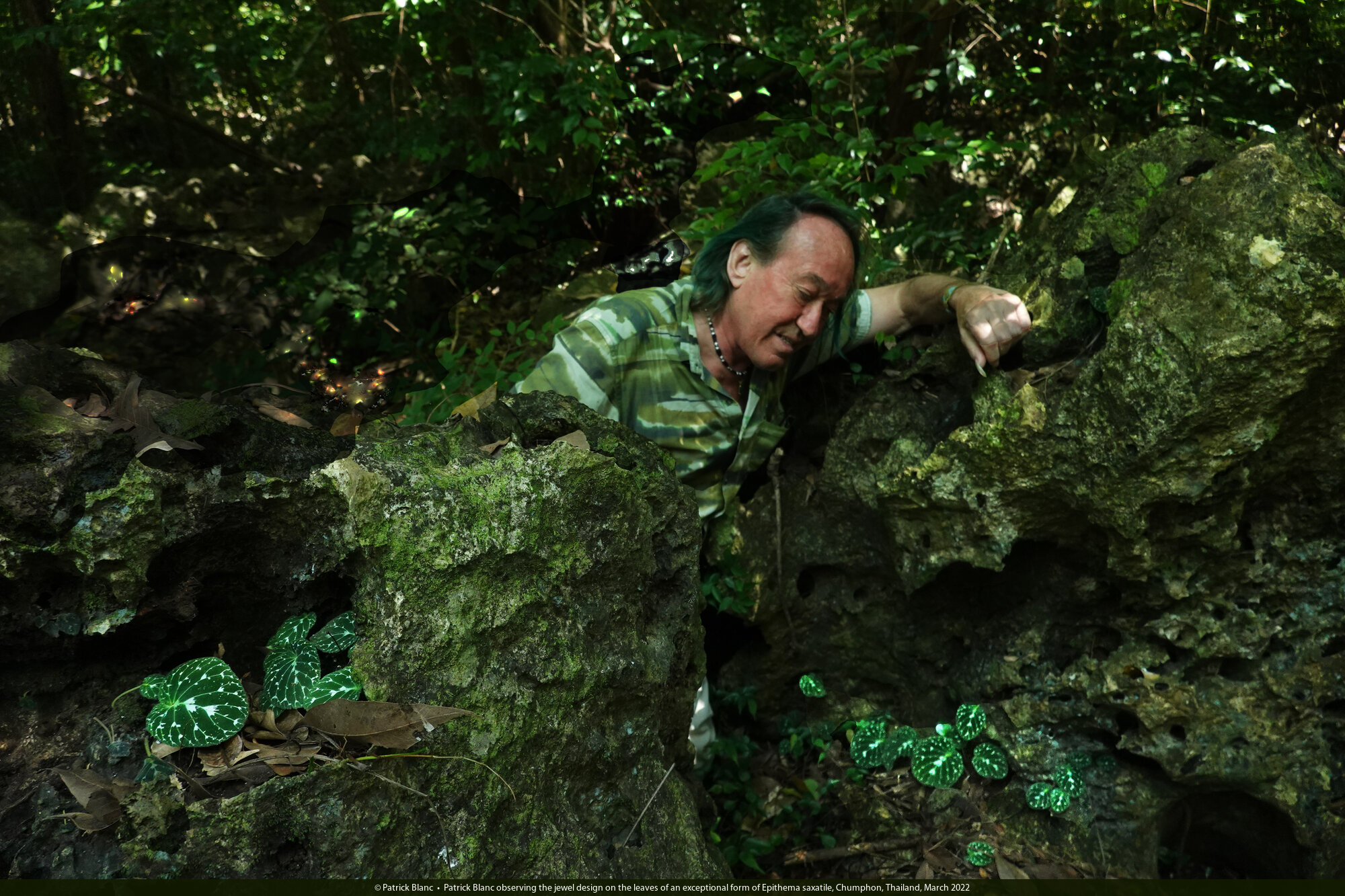Patrick Blanc observing the jewel design on the leaves of an exceptional form of Epithema saxatile, Chumphon, Thailand, March 2022