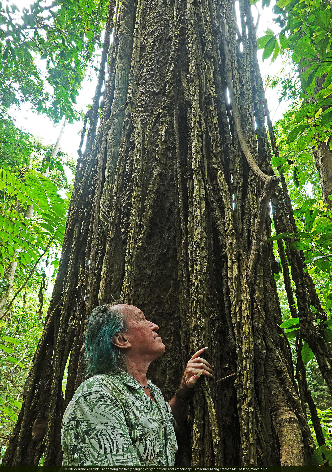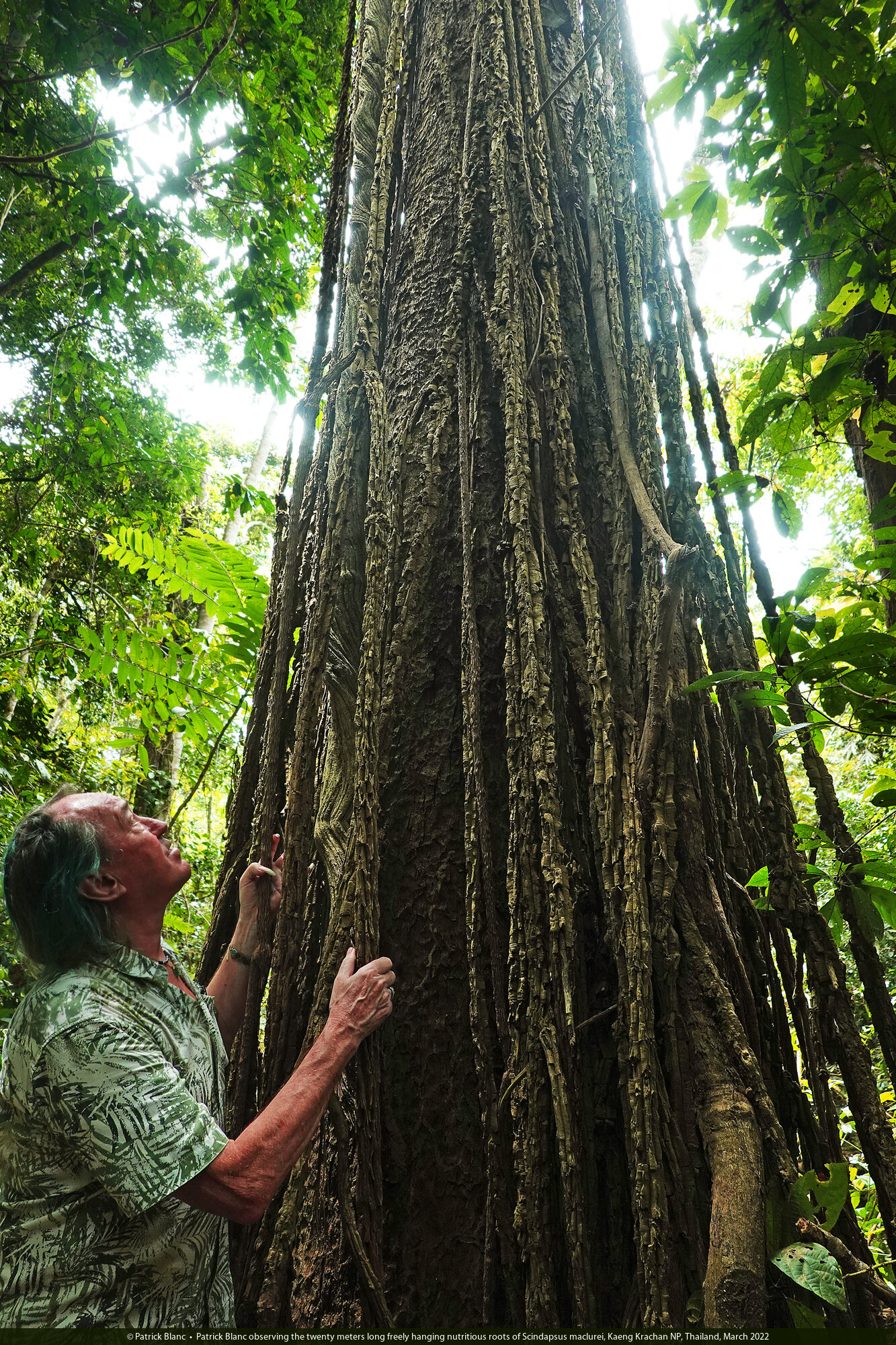 Patrick Blanc observing the twenty meters long freely hanging nutritious roots of Scindapsus maclurei, Kaeng Krachan NP, Thailand, March 2022