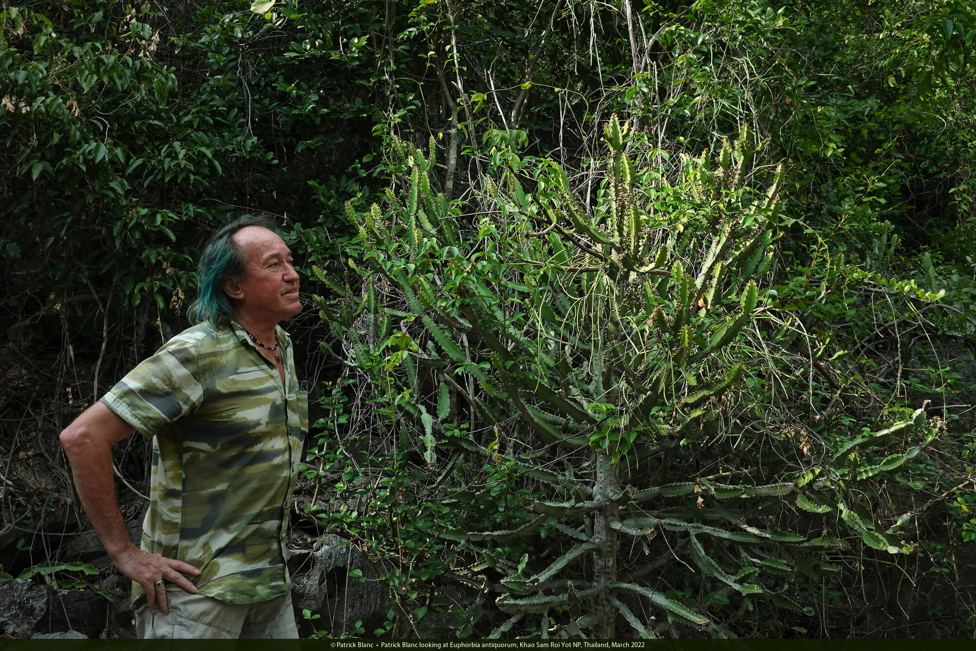 Patrick Blanc looking at Euphorbia antiquorum, Khao Sam Roi Yot NP, Thailand, March 2022