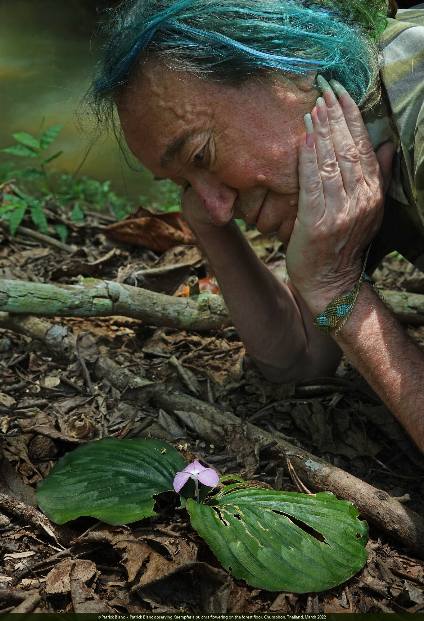 Patrick Blanc observing Kaempferia pulchra flowering on the forest floor, Chumphon, Thailand, March 2022