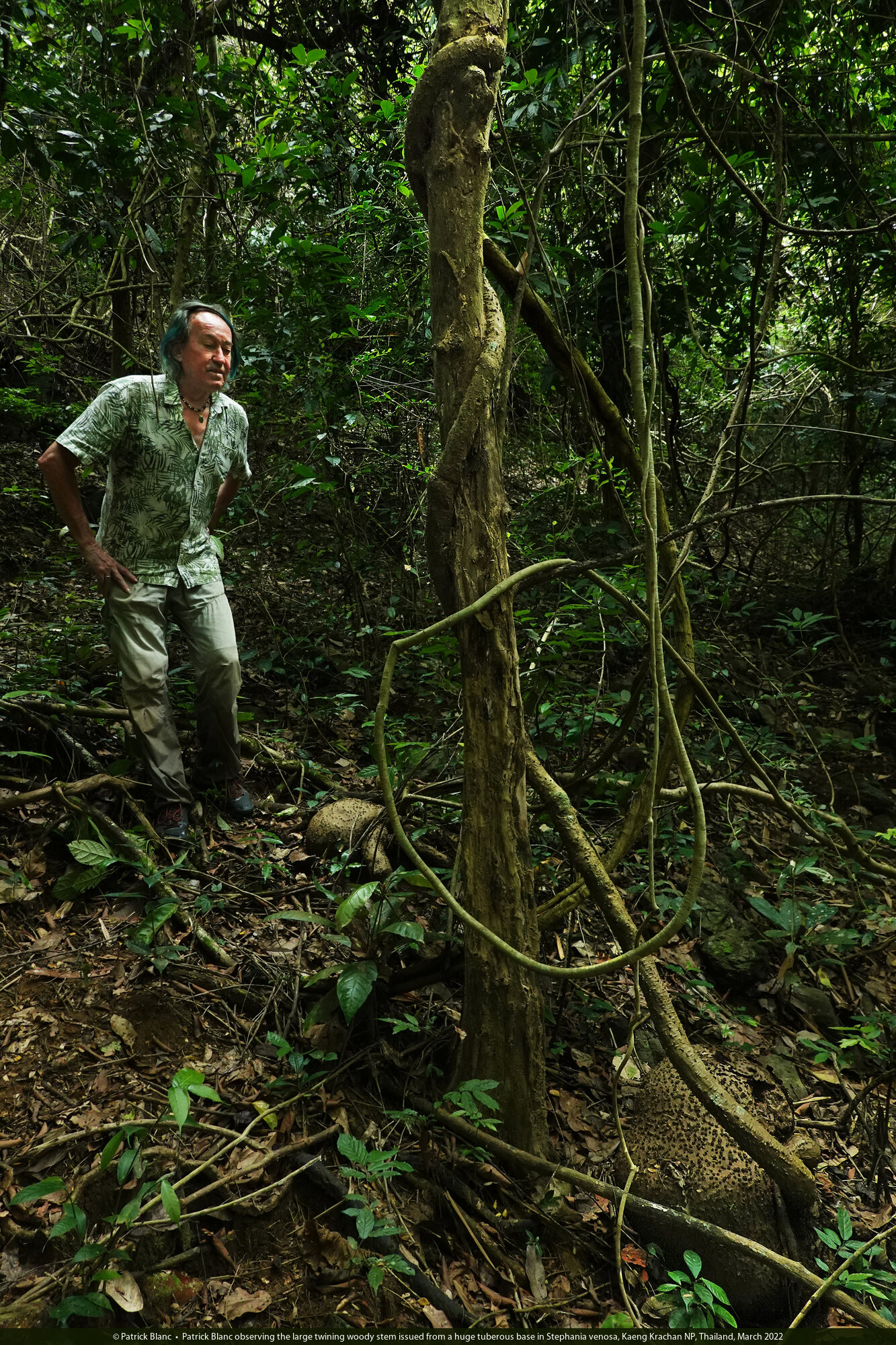 Patrick Blanc observing the large twining woody stem issued from a huge tuberous base in Stephania venosa, Kaeng Krachan NP, Thailand, March 2022