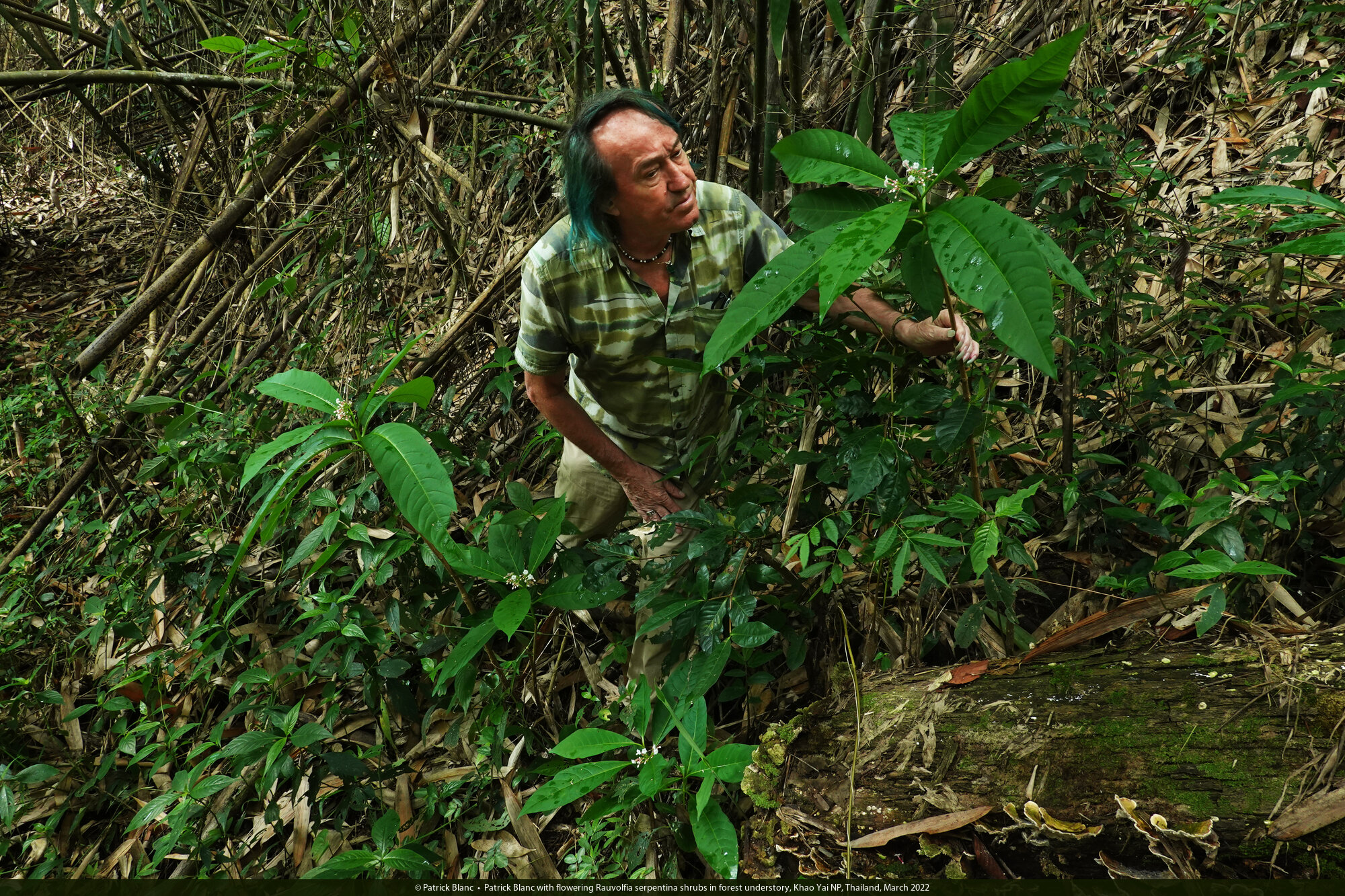 Patrick Blanc with flowering Rauvolfia serpentina shrubs in forest understory, Khao Yai NP, Thailand, March 2022