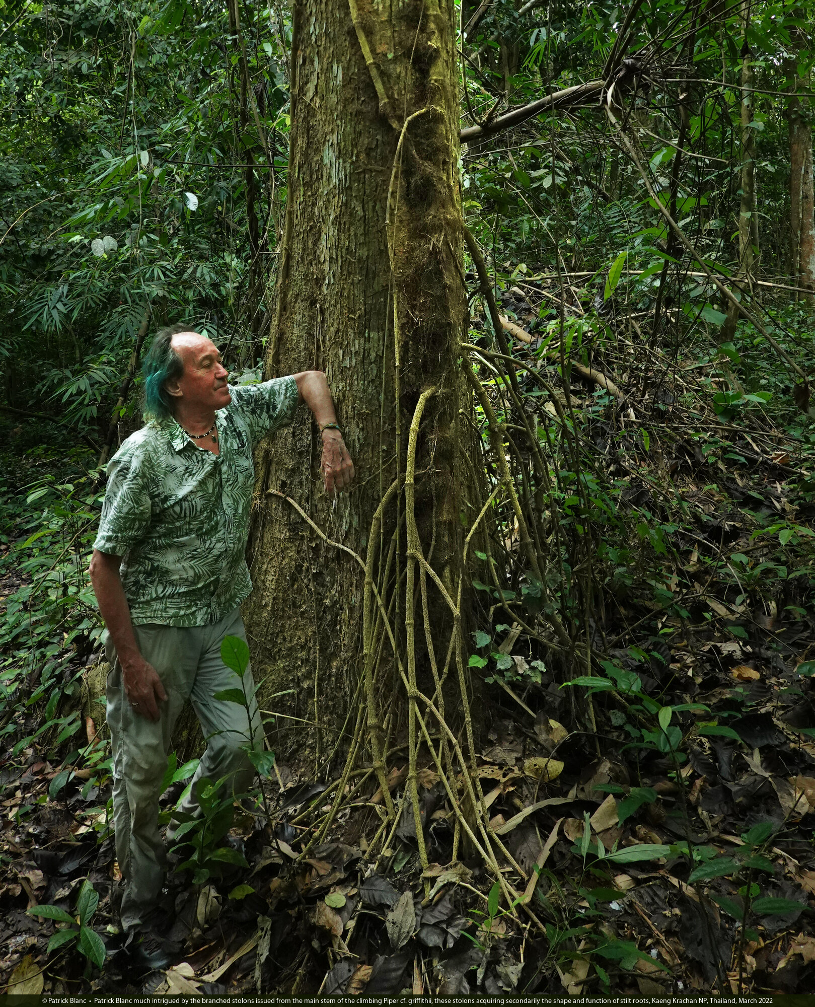 Patrick Blanc much intrigued by the branched stolons issued from the main stem of the climbing Piper cf. griffithii, these stolons acquiring secondarily the shape and function of stilt roots, Kaeng Krachan NP, Thailand, March 2022