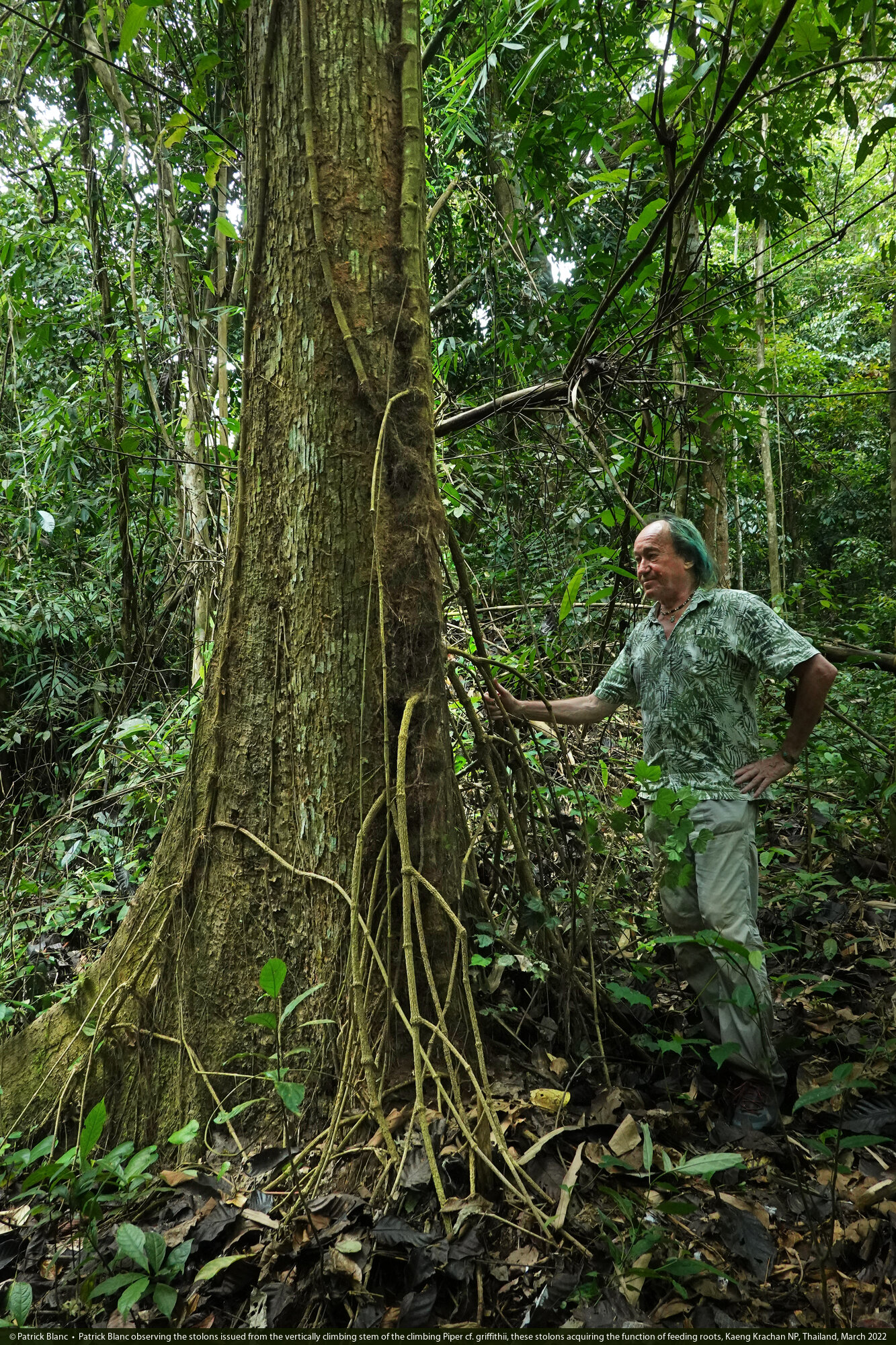 Patrick Blanc observing the stolons issued from the vertically climbing stem of the climbing Piper cf. griffithii, these stolons acquiring the function of feeding roots, Kaeng Krachan NP, Thailand, March 2022