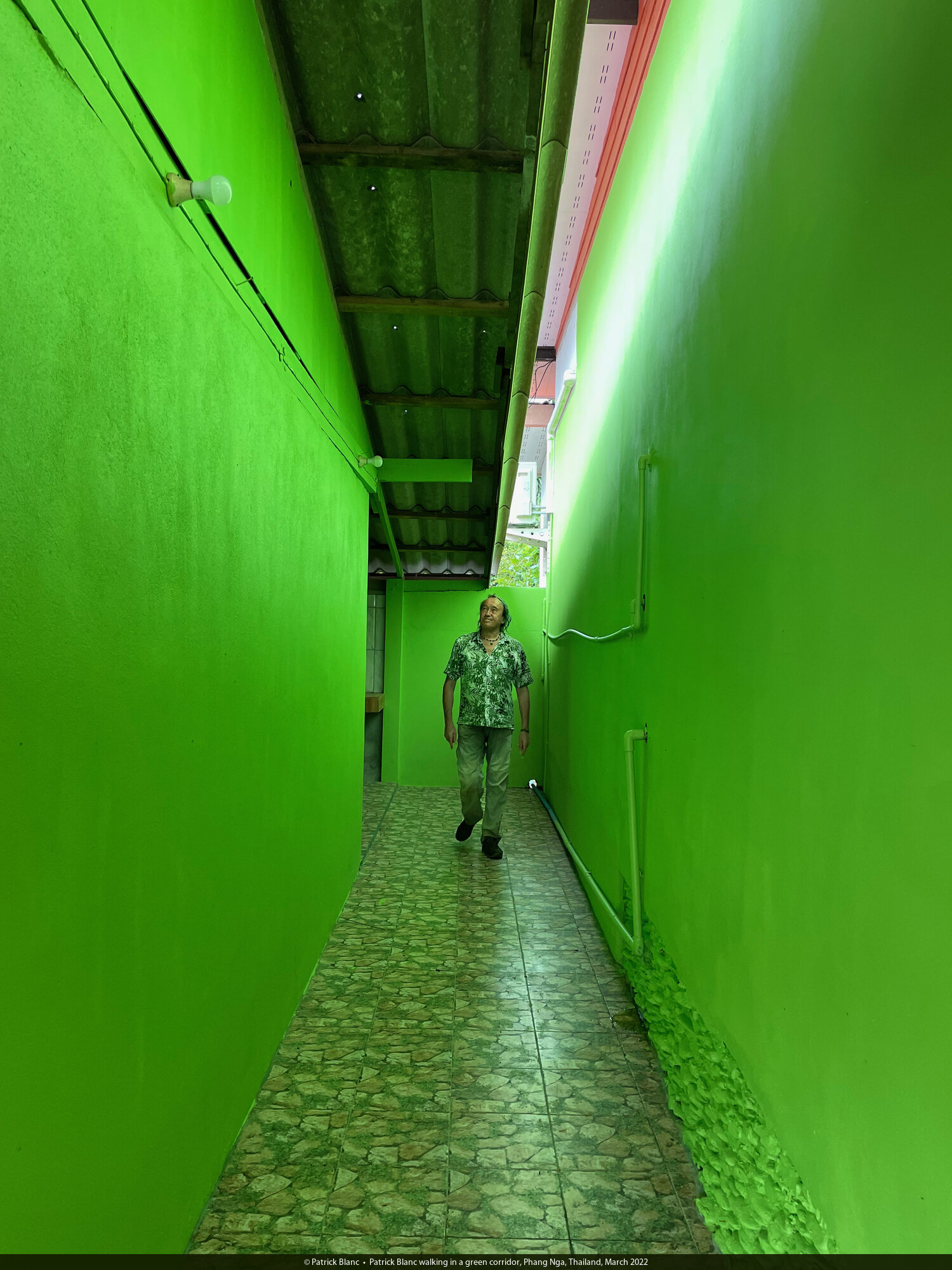 Patrick Blanc walking in a green corridor, Phang Nga, Thailand, March 2022