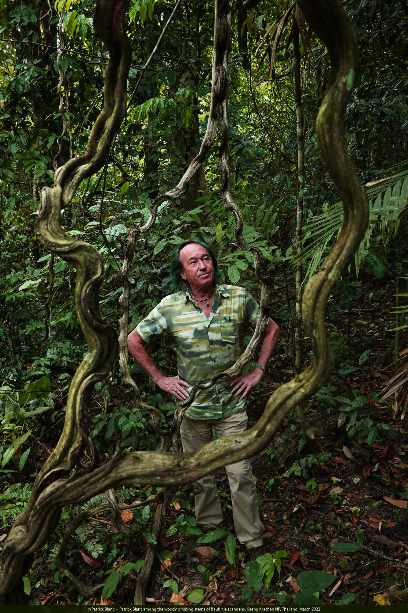 Patrick Blanc among the woody climbing stems of Bauhinia scandens, Kaeng Krachan NP, Thailand, March 2022