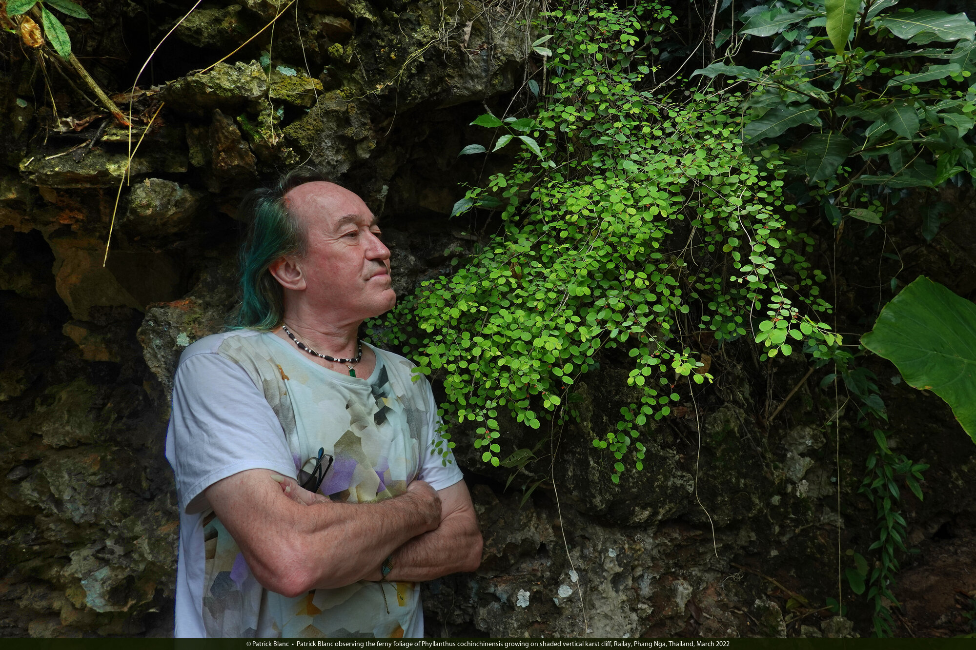 Patrick Blanc observing the ferny foliage of Phyllanthus cochinchinensis growing on shaded vertical karst cliff, Railay, Phang Nga, Thailand, March 2022