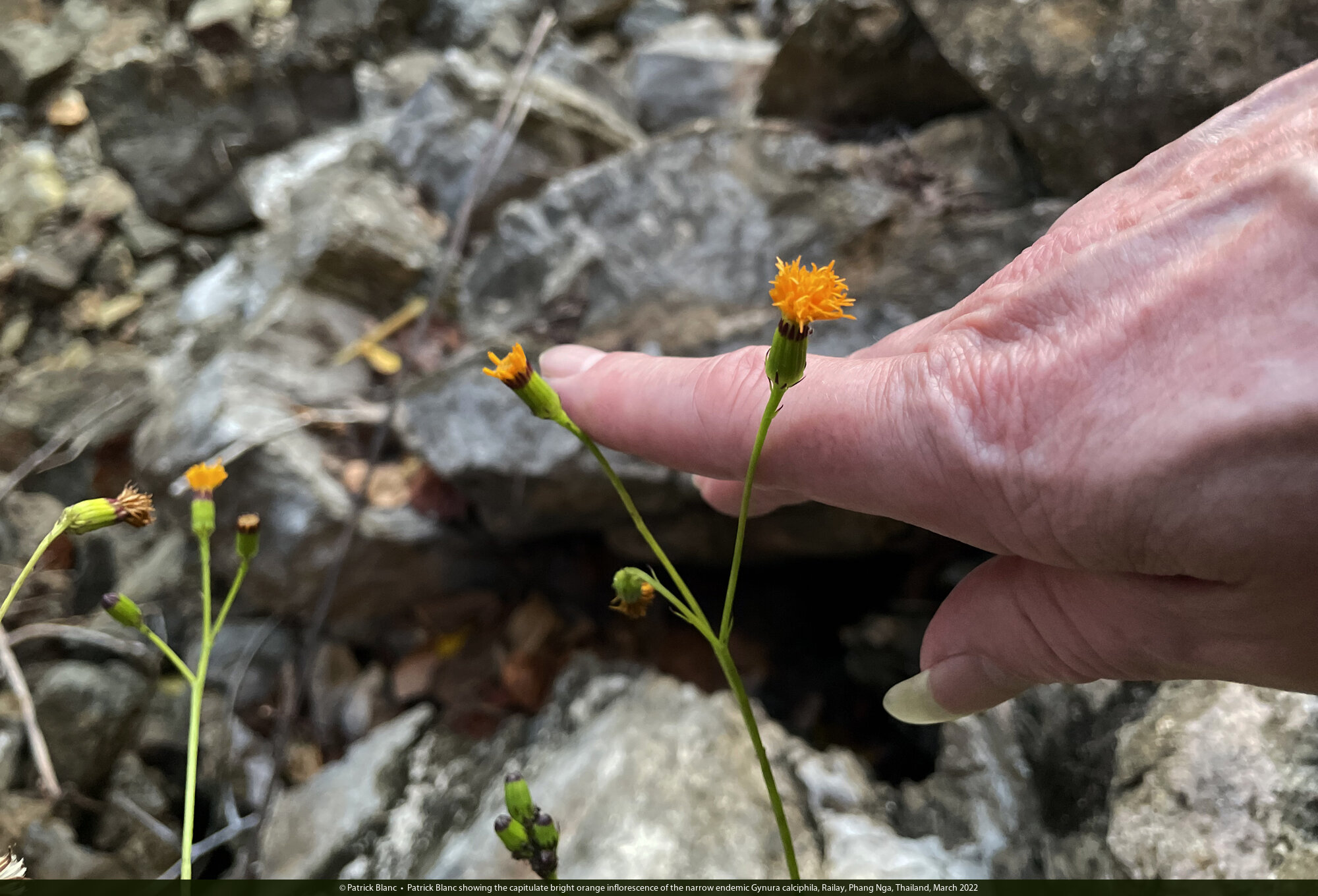 Patrick Blanc showing the capitulate bright orange inflorescence of the narrow endemic Gynura calciphila, Railay, Phang Nga, Thailand, March 2022