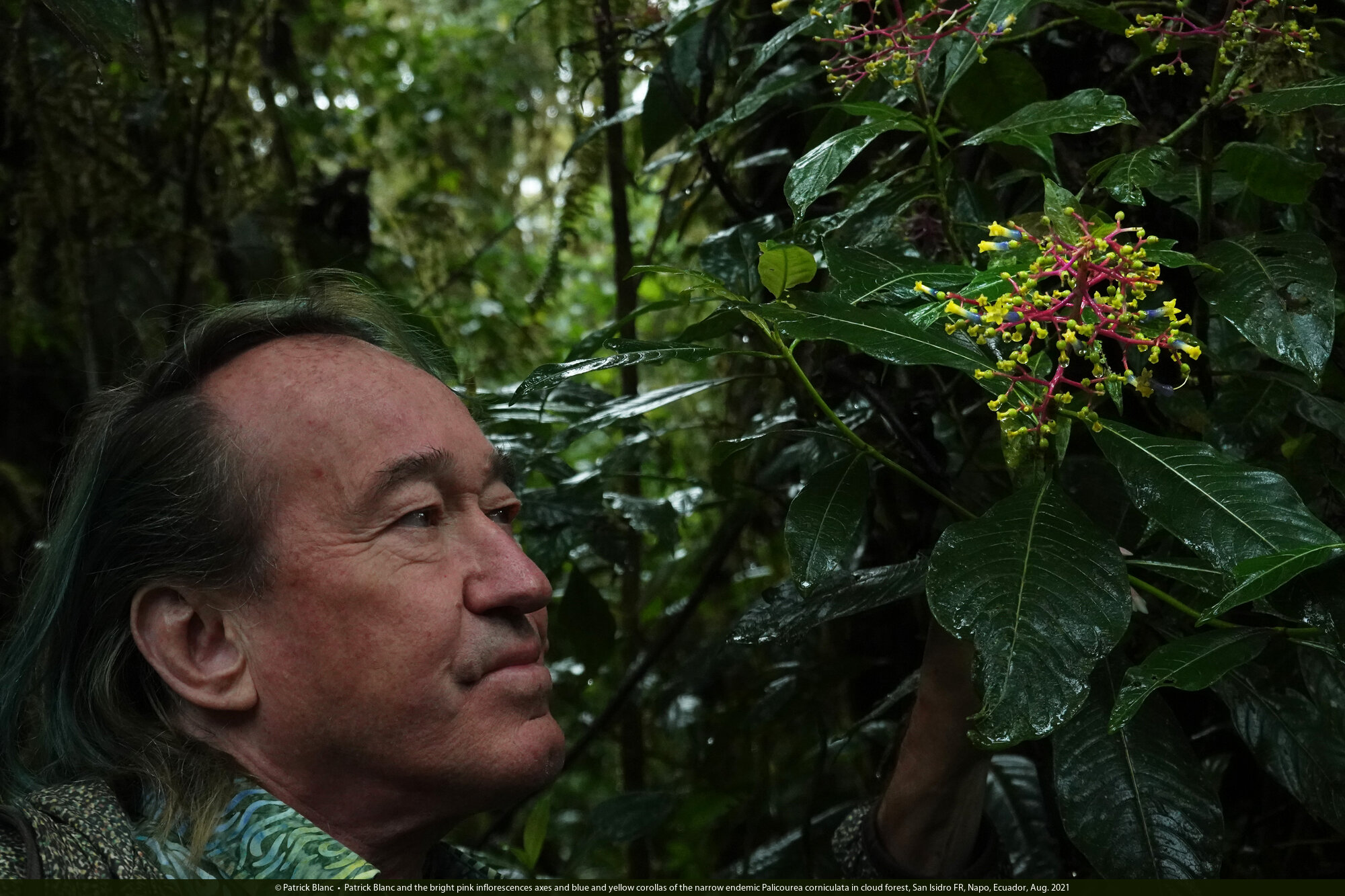Patrick Blanc observing the bright pink inflorescences axes and blue and yellow corollas of the narrow endemic Palicourea corniculata in cloud forest, San Isidro FR, Napo, Ecuador, Aug. 2021