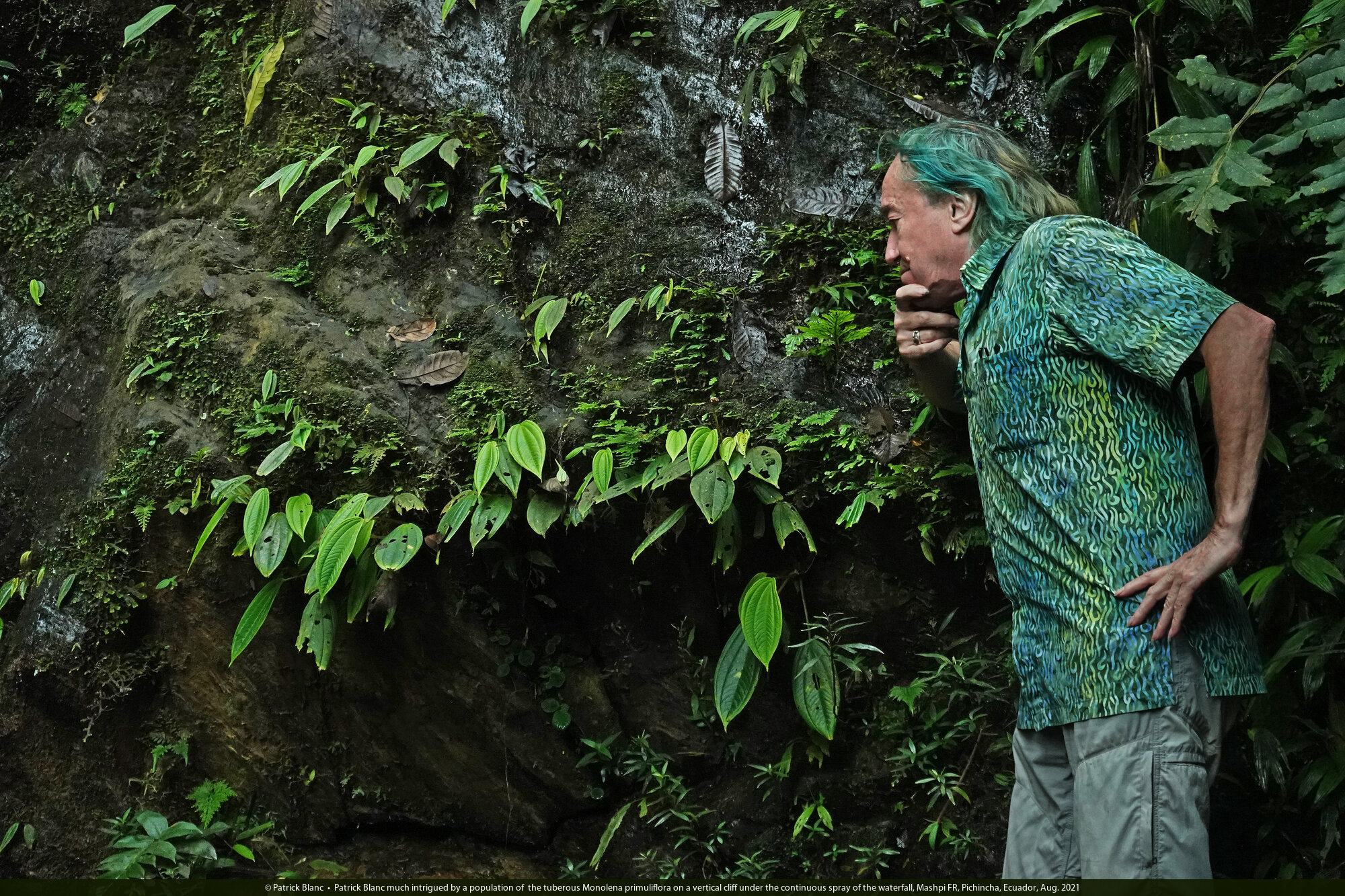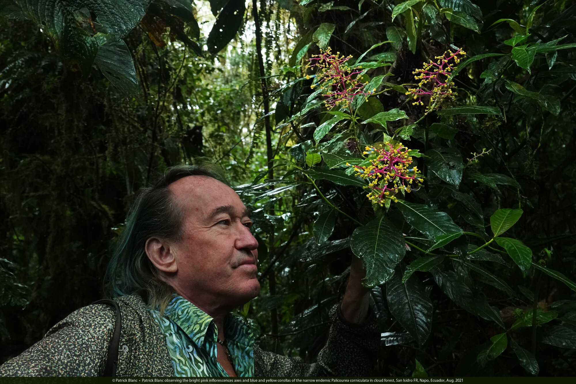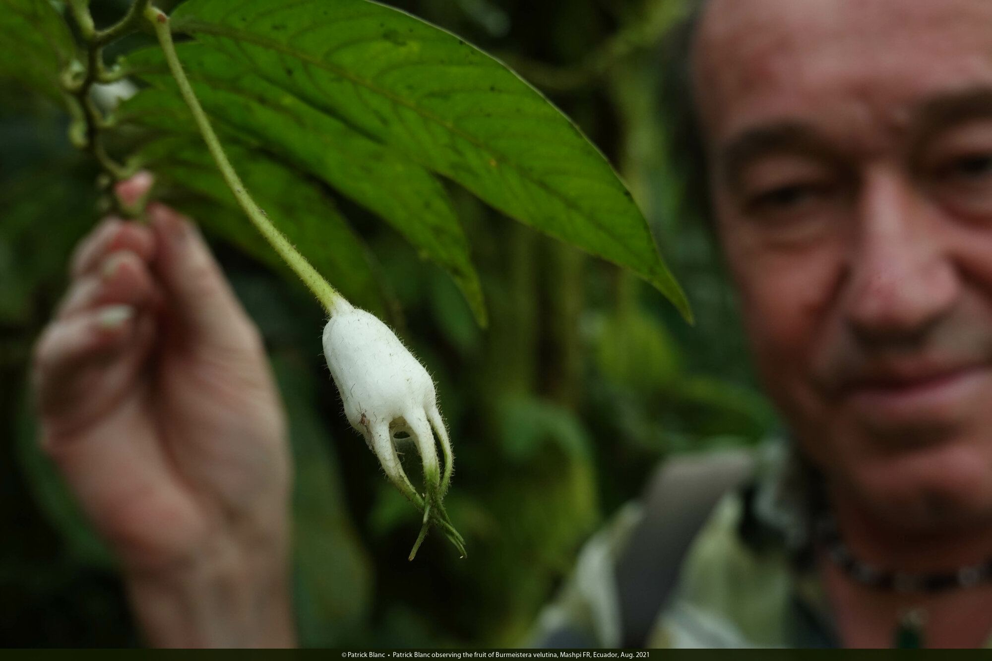 Patrick Blanc observing the fruit of Burmeistera velutina, Mashpi FR, Ecuador, Aug. 2021