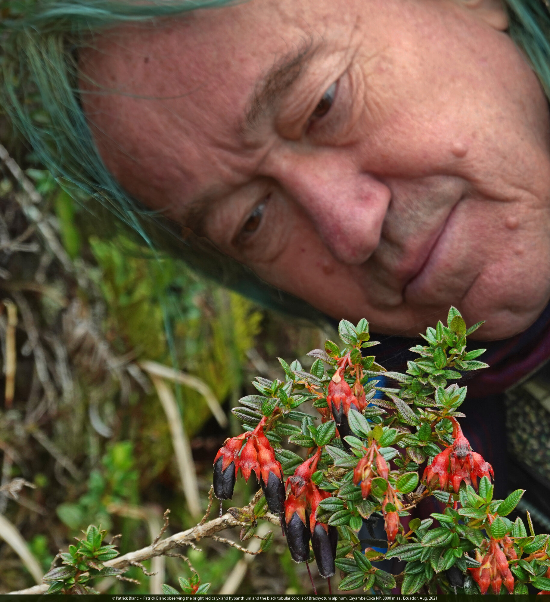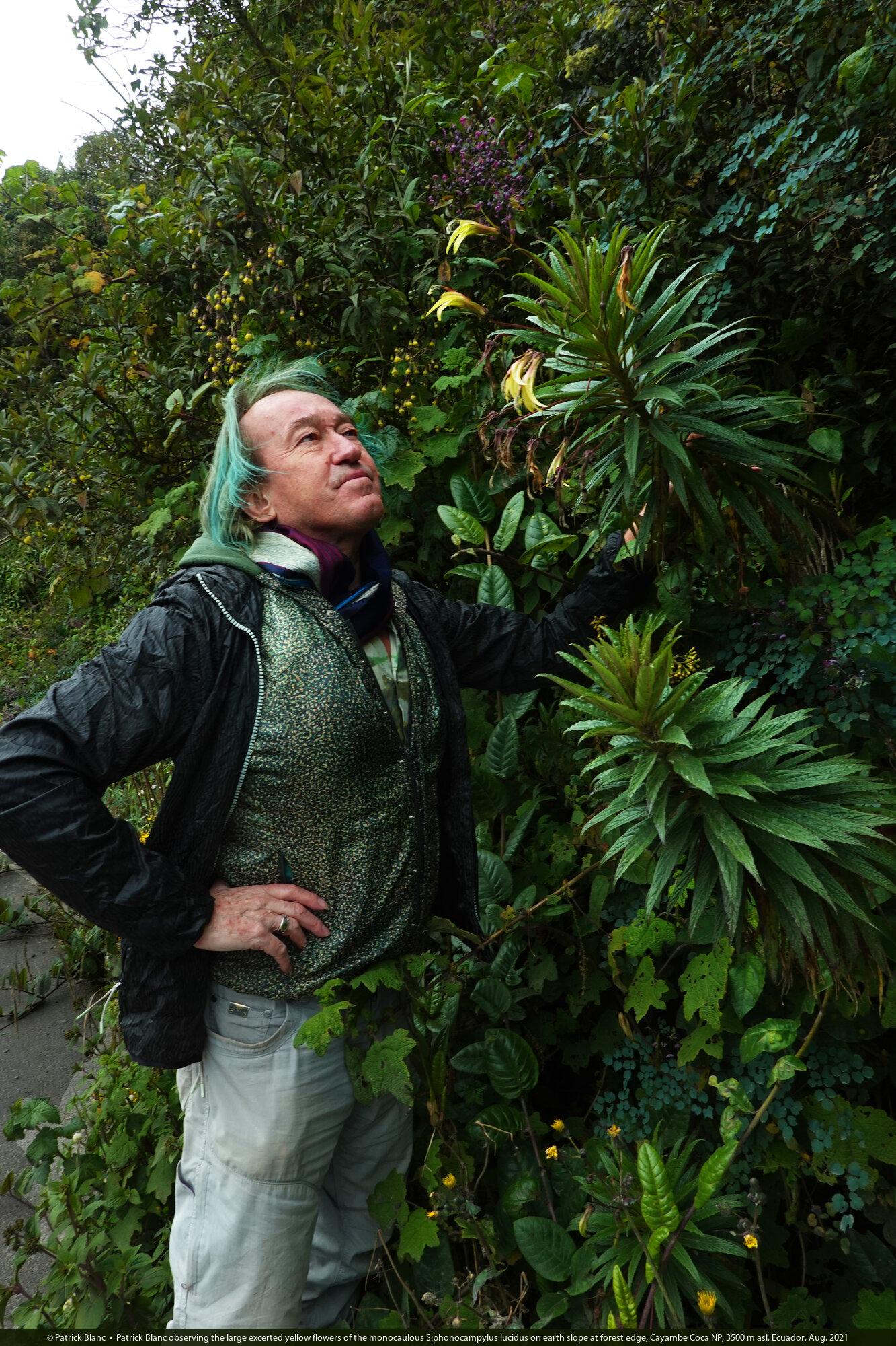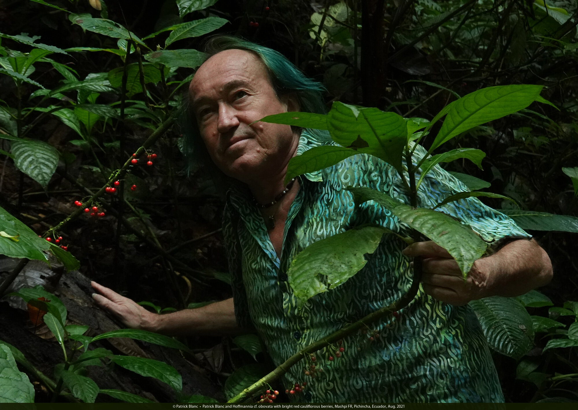 Patrick Blanc observing the fruit of Burmeistera velutina, Mashpi FR, Ecuador, Aug. 2021