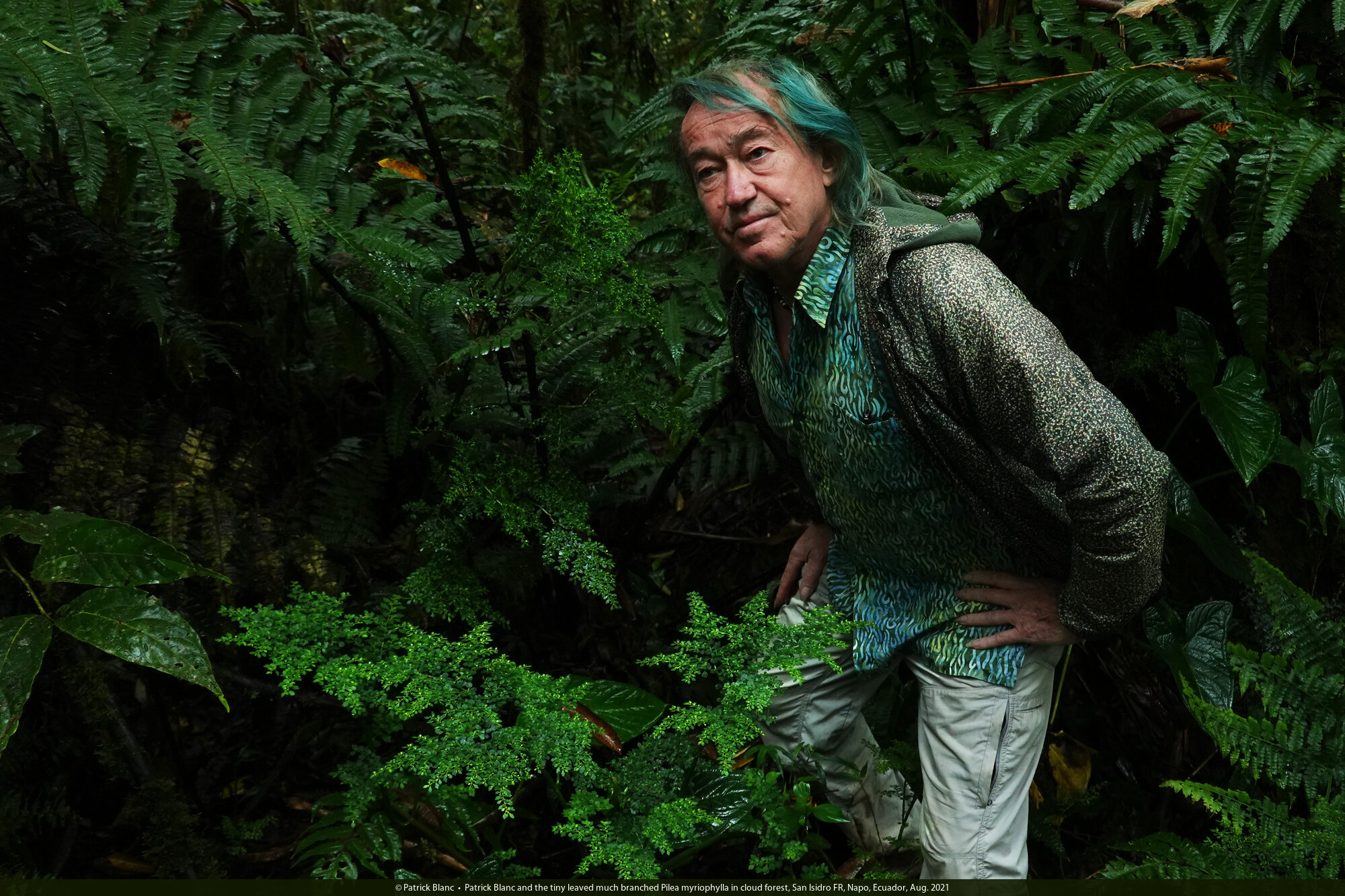Patrick Blanc and the tiny leaved much branched Pilea myriophylla in cloud forest, San Isidro FR, Napo, Ecuador, Aug. 2021
