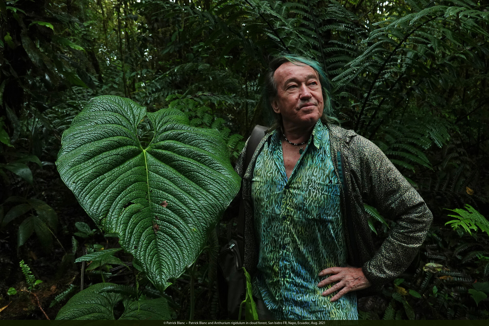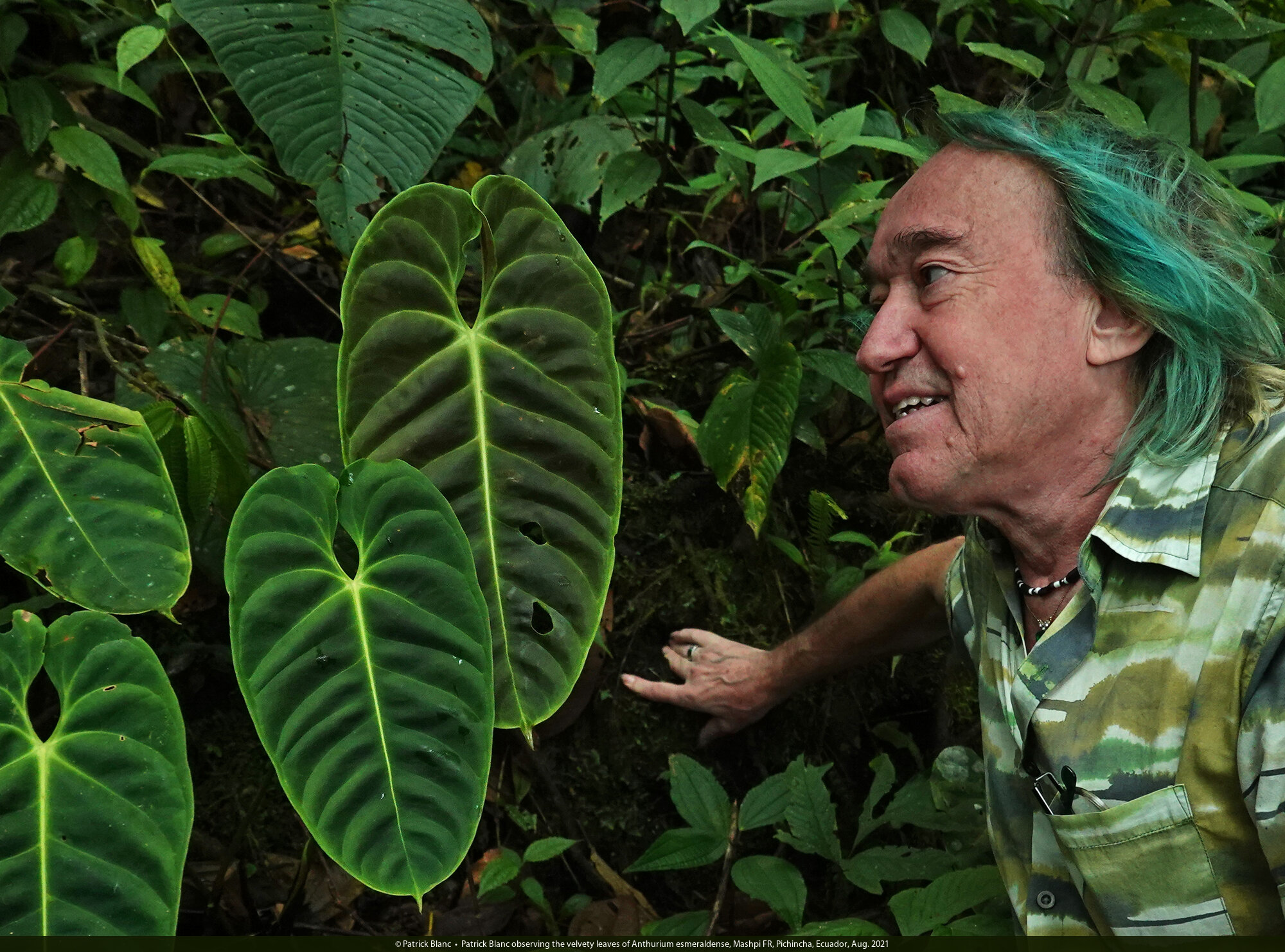 Patrick Blanc observing the velvety leaves of Anthurium esmeraldense, Mashpi FR, Pichincha, Ecuador, Aug. 2021