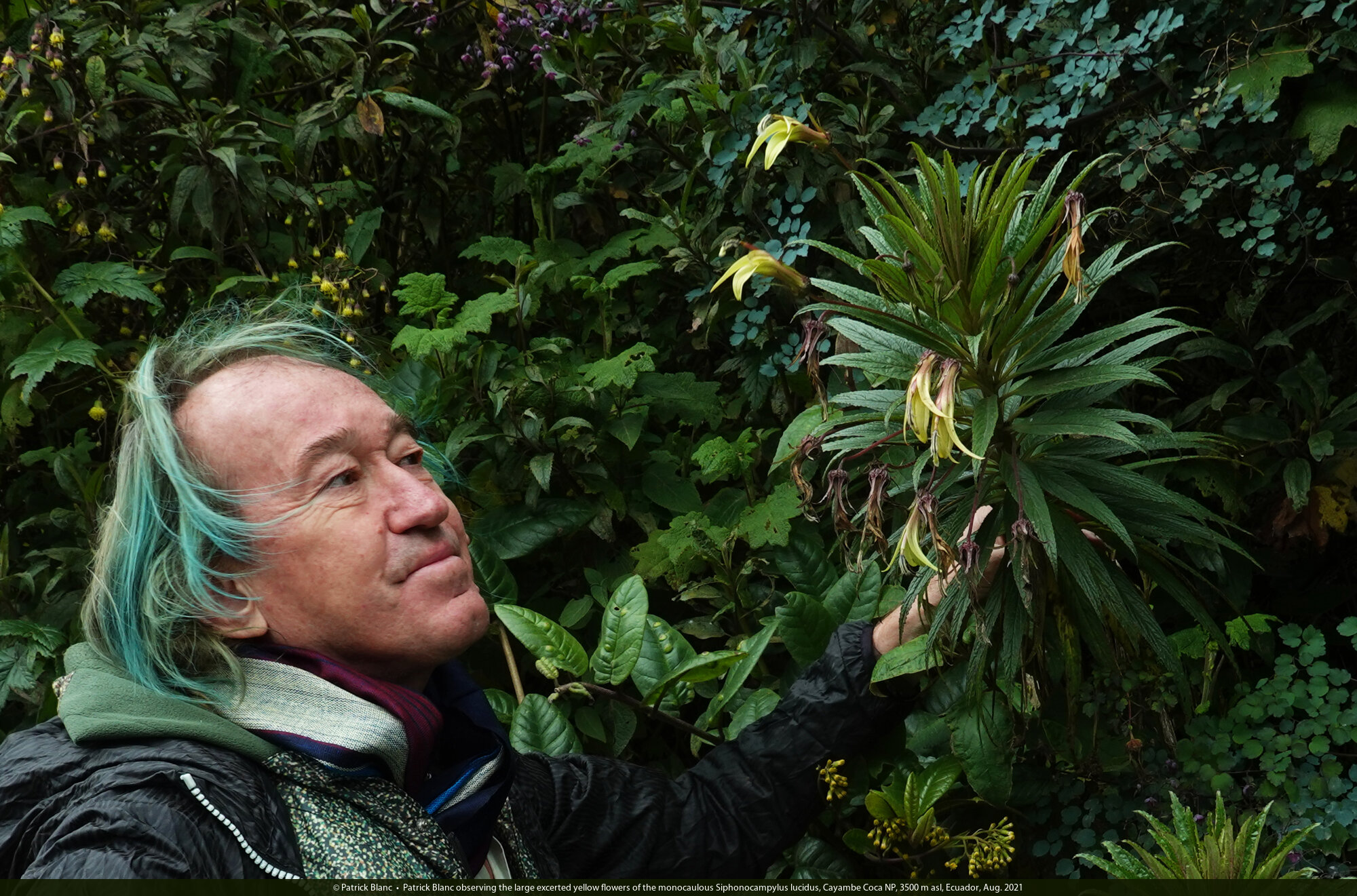 Patrick Blanc observing the large excerted yellow flowers of the monocaulous Siphonocampylus lucidus on earth slope at forest edge, Cayambe Coca NP, 3500 m asl, Ecuador, Aug. 2021