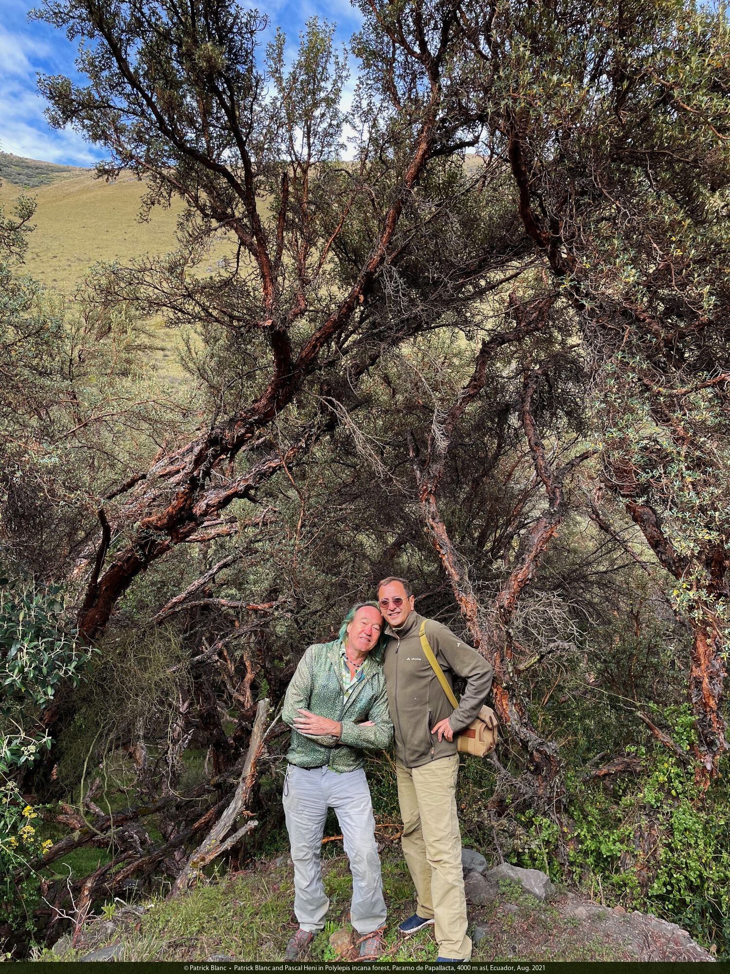 Patrick Blanc and Pascal Heni in Polylepis incana forest, Paramo de Papallacta, 4000 m asl, Ecuador, Aug. 2021